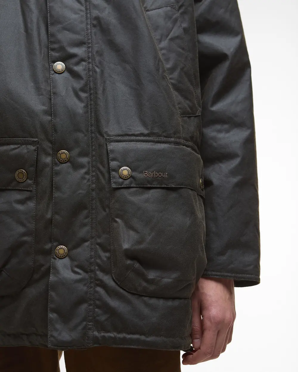 Barbour-broderi på bärarens nedre vänstra fickflik.