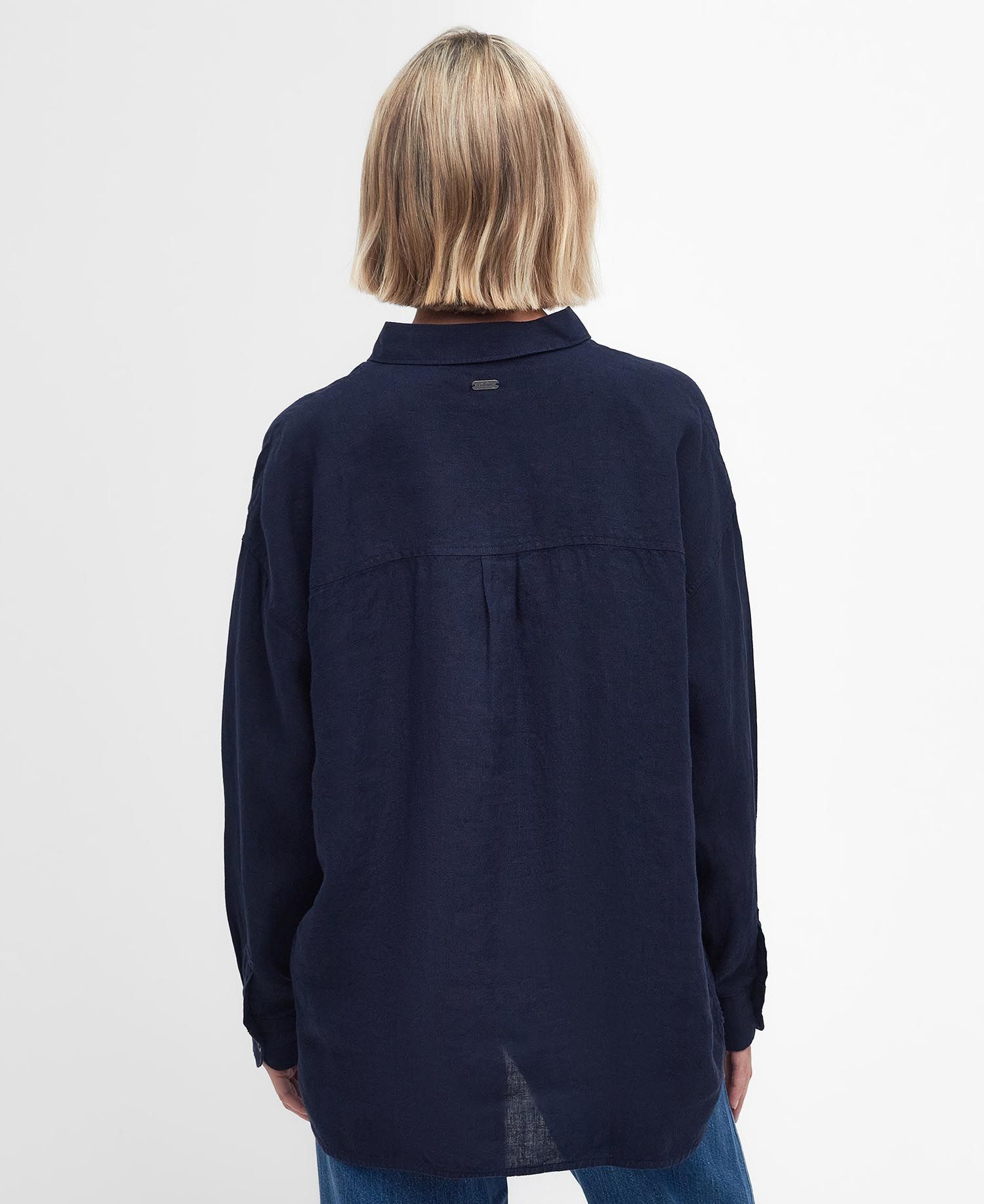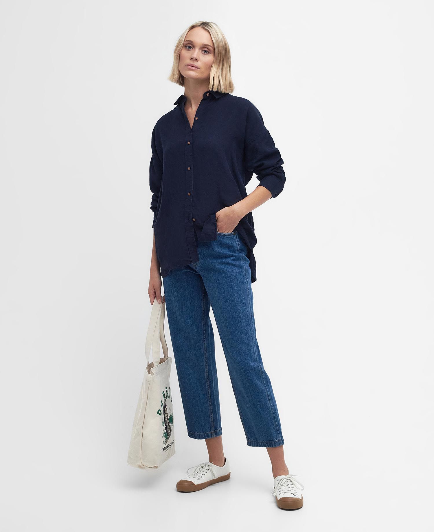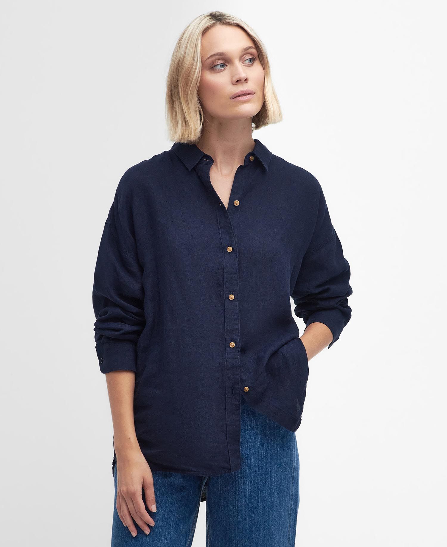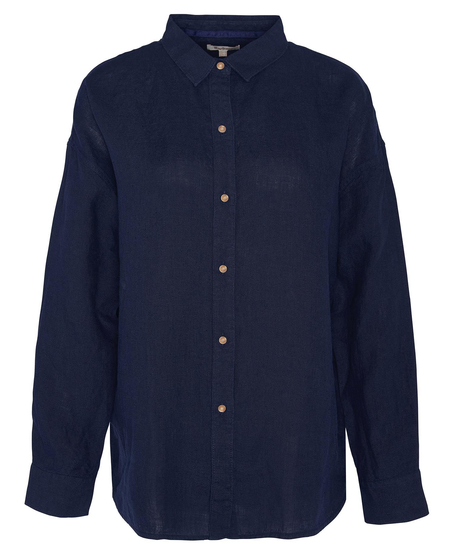 Uppgradera din garderob med en elegant klimatsnäll linneskjorta från Barbour. Somrigt tidlös marinblå skjorta med stilrena kontrasterande knappar.