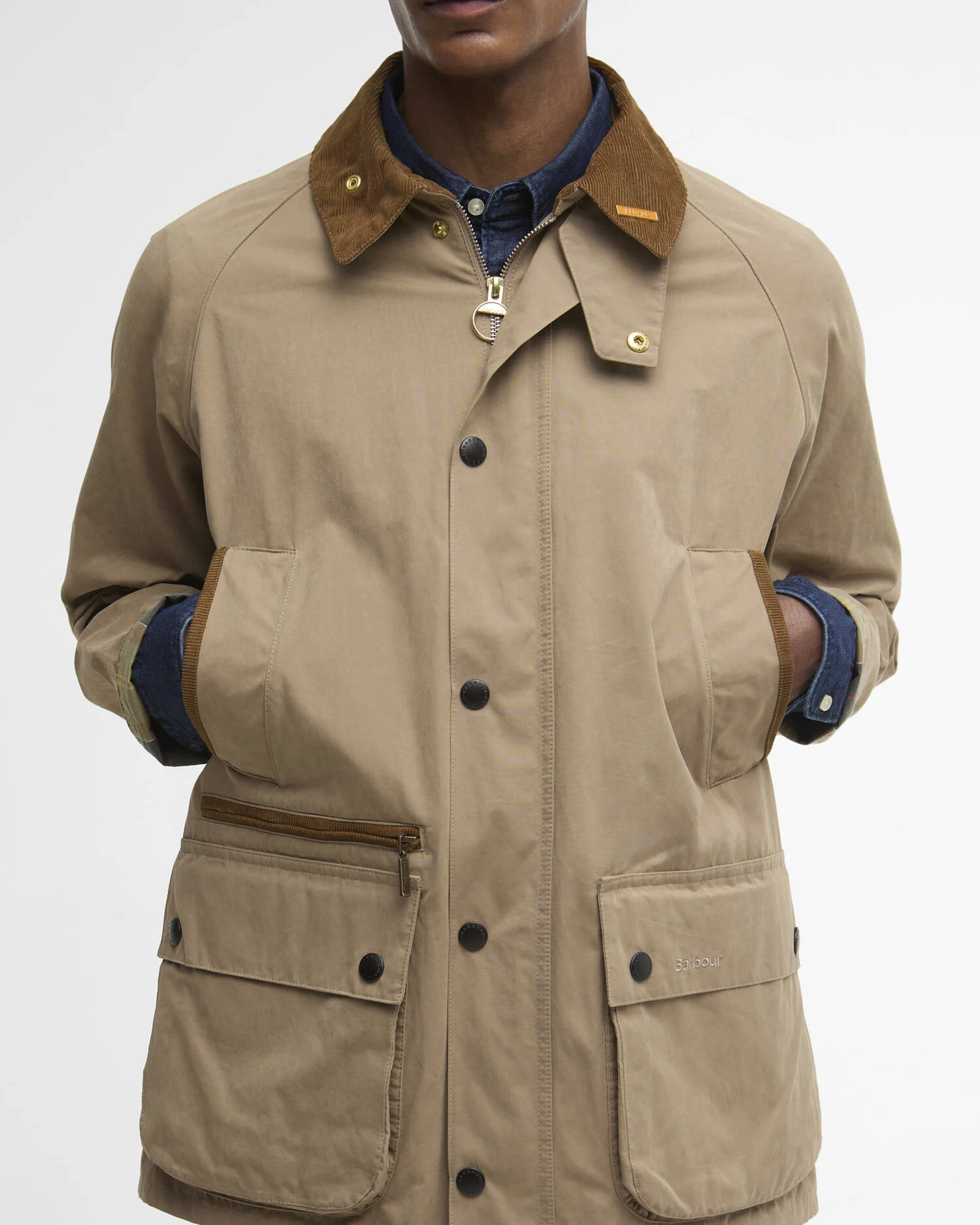 Barbour-broderi på bärarens vänstra ficka. Namnmärke med jacka på kragen.