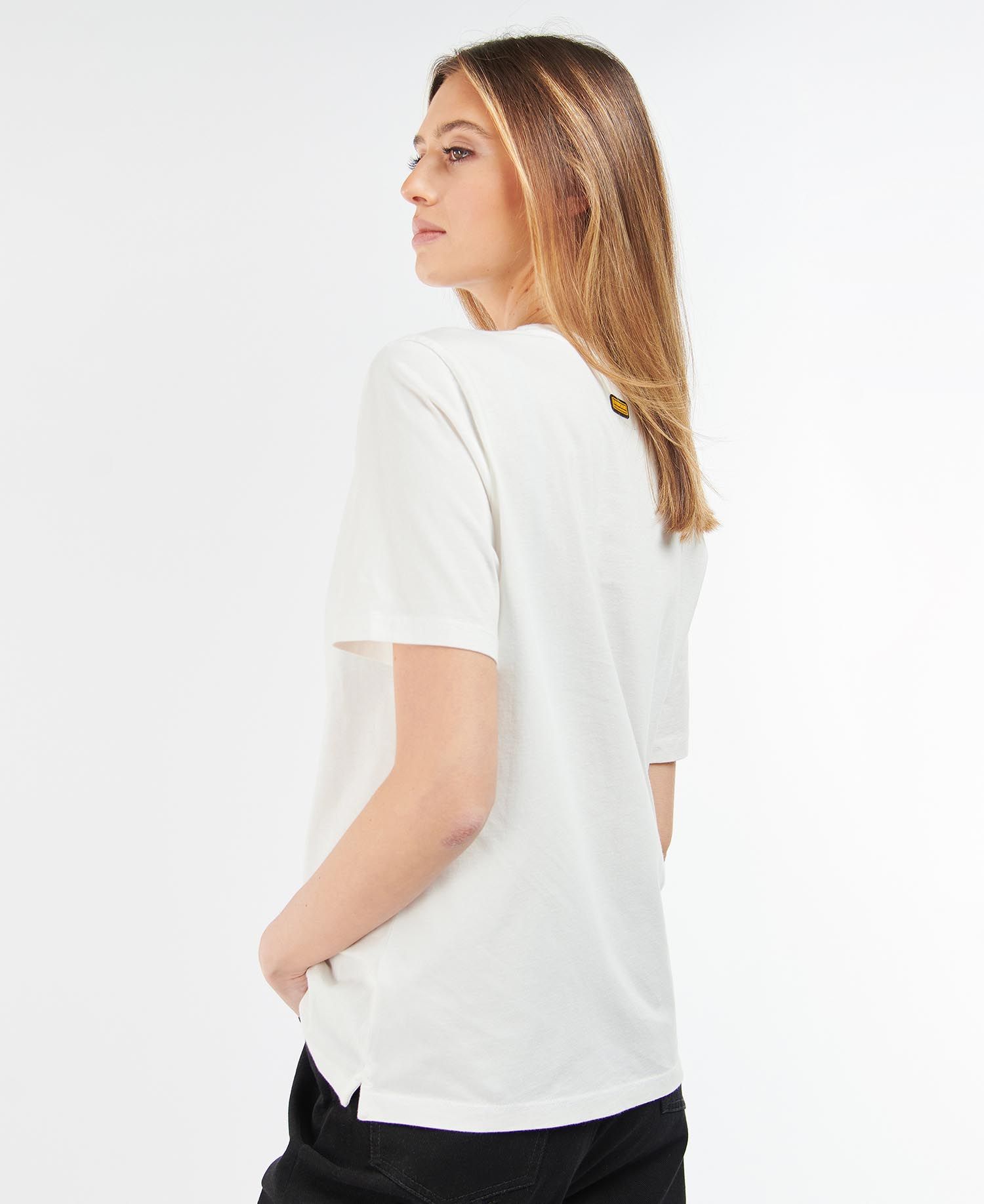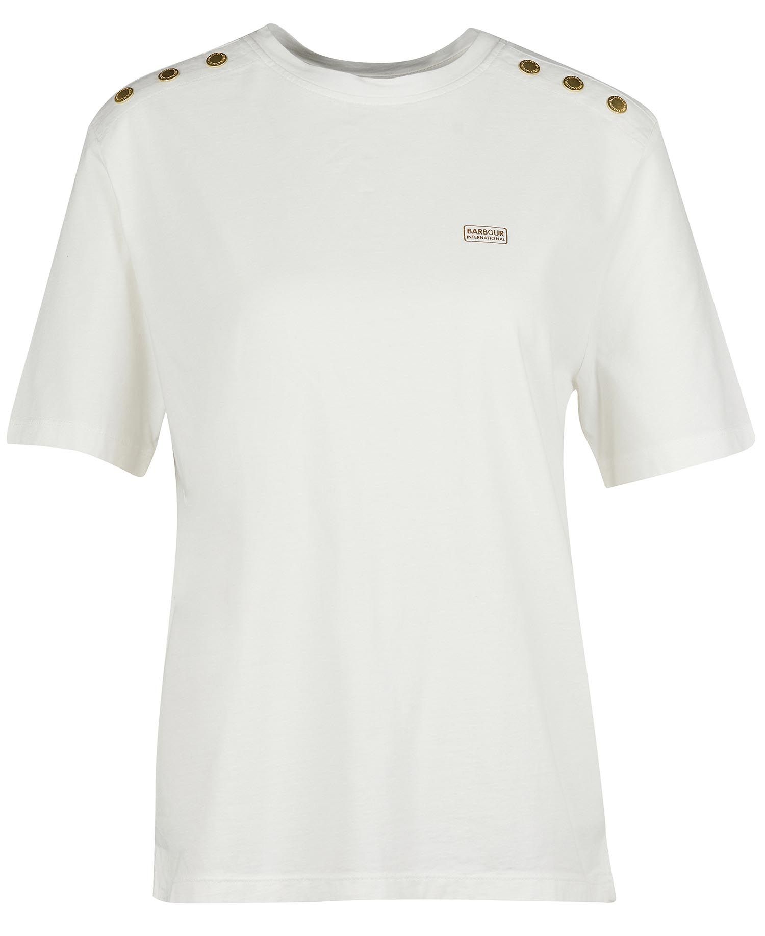Crèmefärgad tisha från Barbour International med dekorativa guldknappar över axlarna. Diskret logo i guld på bröstet.