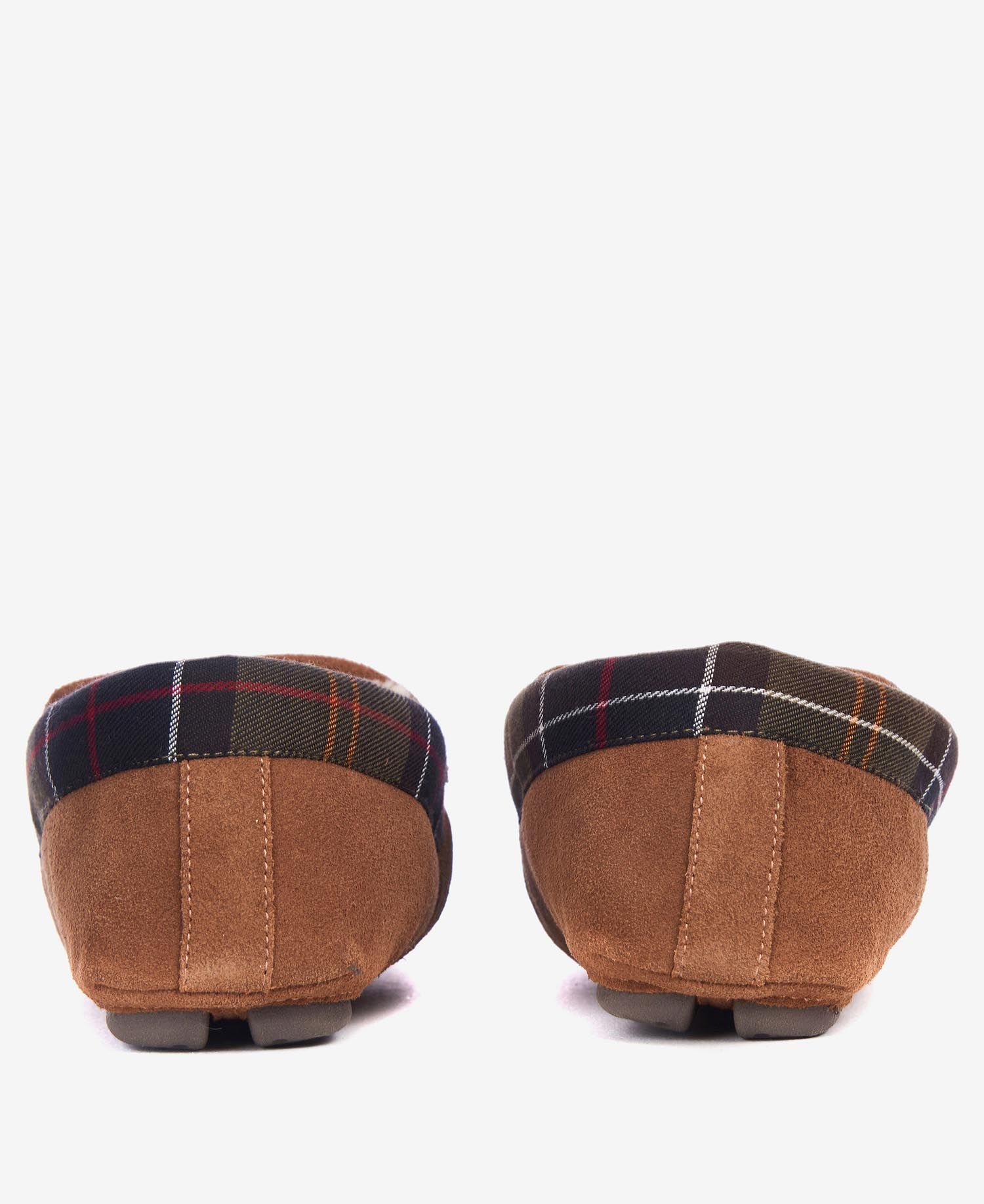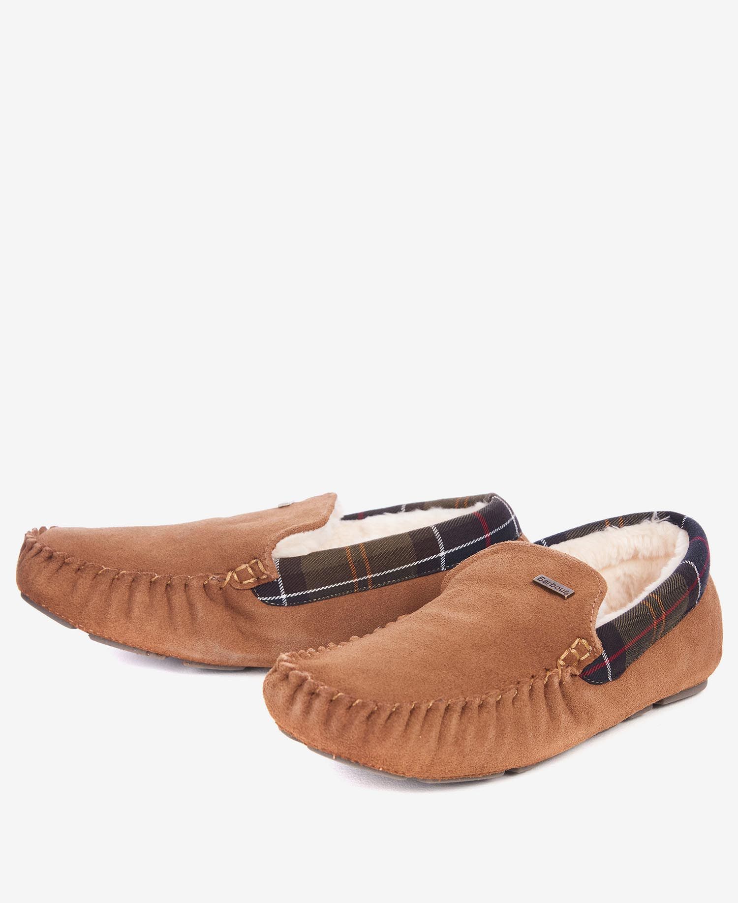 Mysiga tofflor från Barbour i en klädsam loafers-modell. Camelfärgad mocka kantad med Barbours klassiska tartan utvändigt, fodrade med mysig fuskpäls, sula med bra gummigrepp.