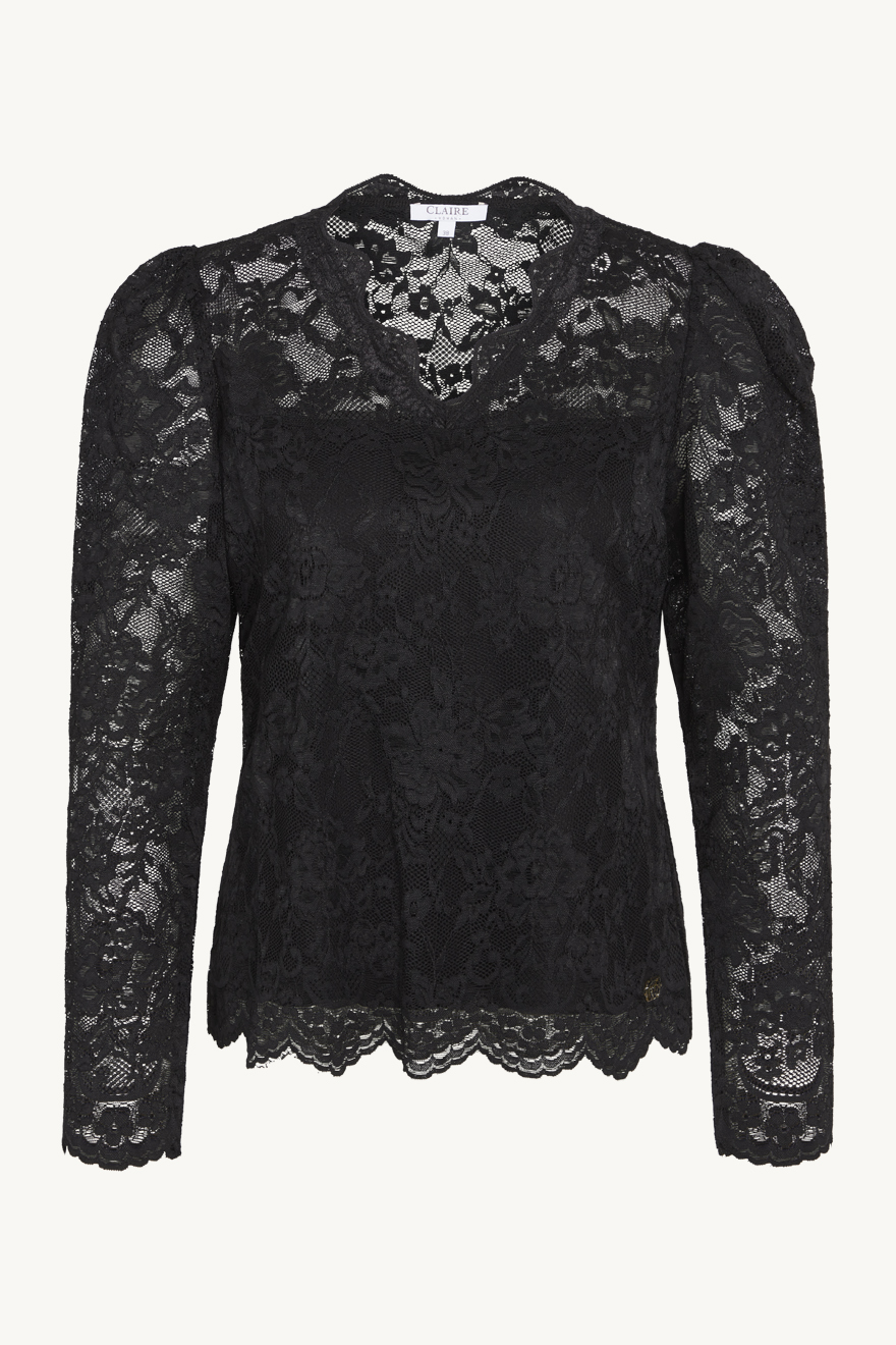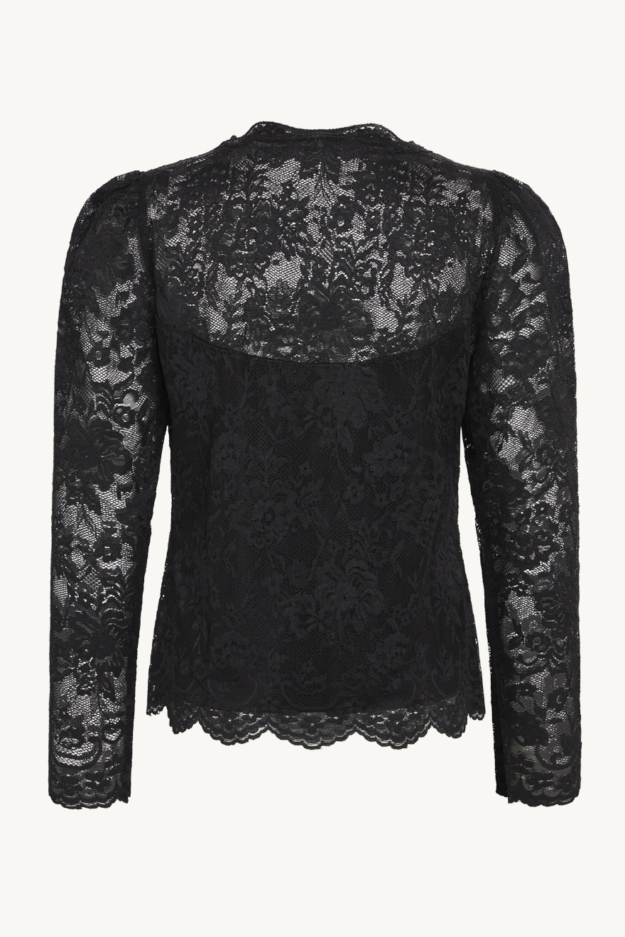 Blus i spets med V-ringning och liggande på axlarna. Modellen har vågiga kanter vid ärmarna och nertill. Blusen har en mjuk insida.