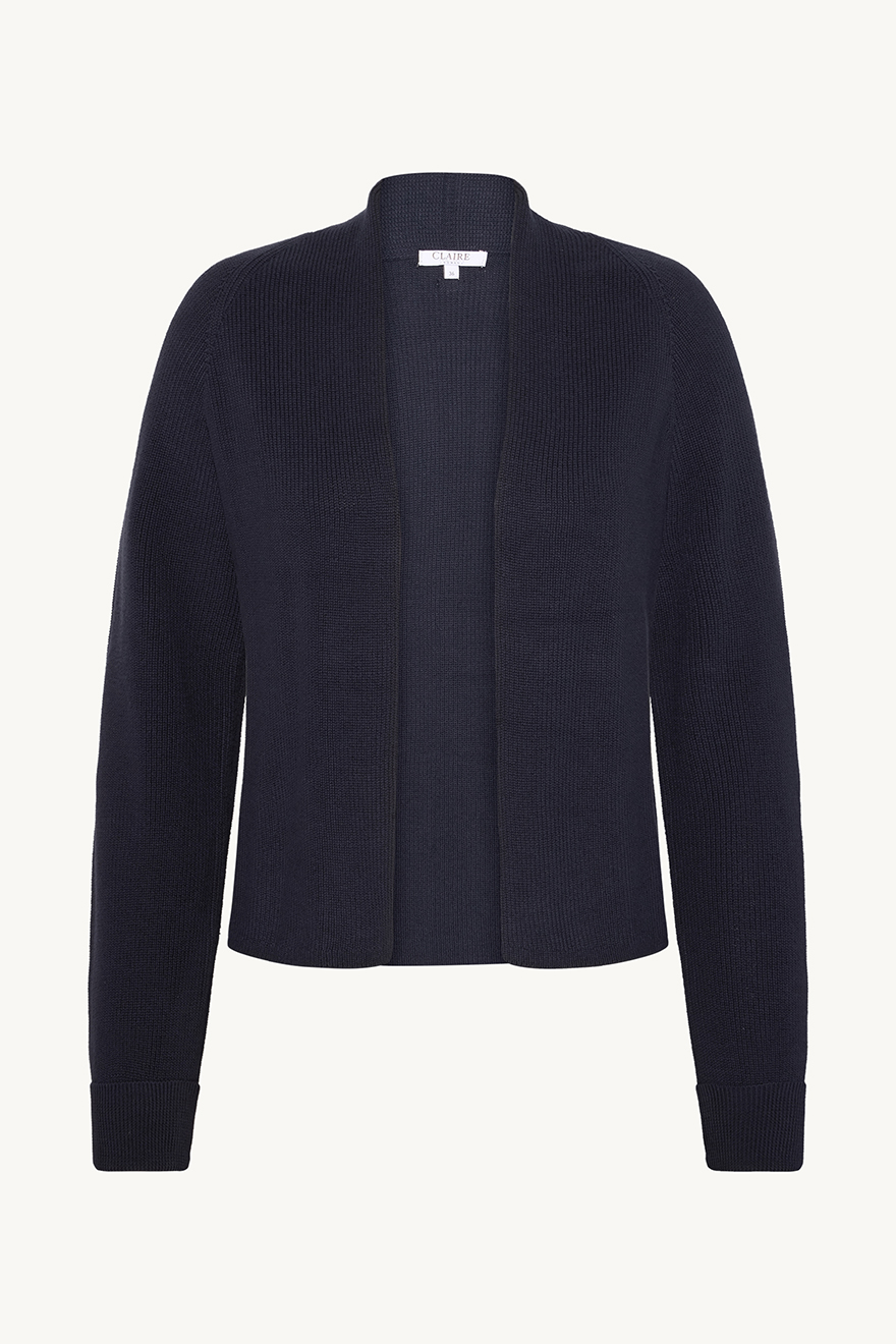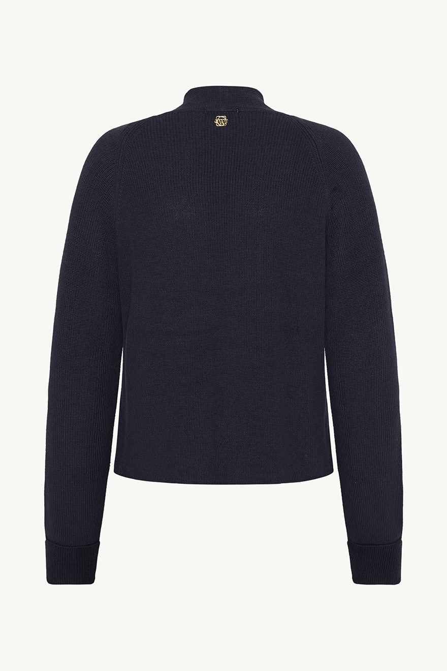 Stickad kofta i mjuk bomull. Modellen har ett litet guldemblem på halsen. Denna produkt är gjord av 100% ekologisk bomull.