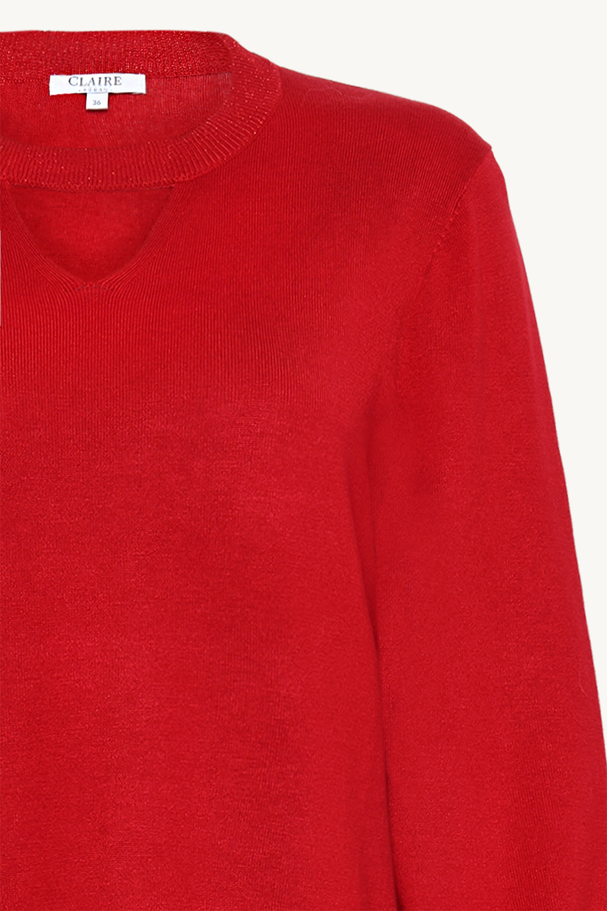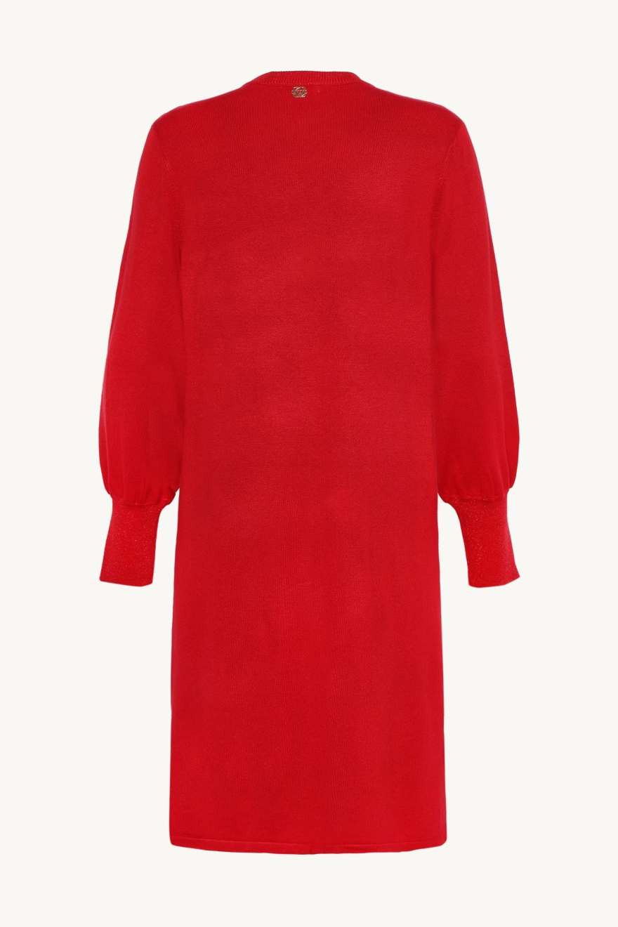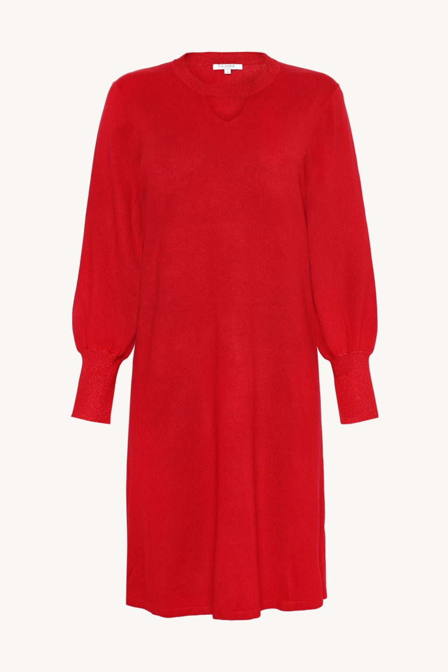 Stickad klänning i mjuk viskos med utskärning på bröstet. Modellen har glitterdetaljer i halsen och på ärmarna.