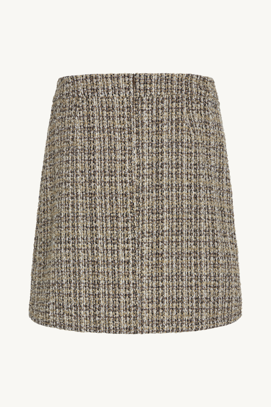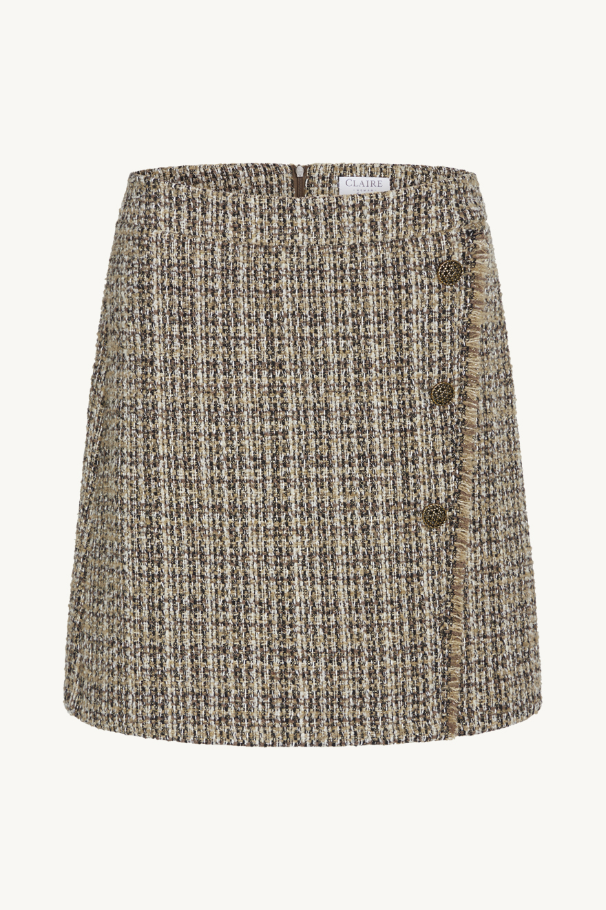 Fodrad kjol i bouclekvalitet med fransar och dekorativa knappar på vänster sida. Modellen har en osynlig dragkedja mitt bak. Denna modell har en längd på 50 cm i storlek 38. Denna produkt är tillverkad i EU.