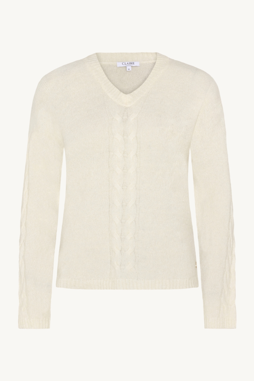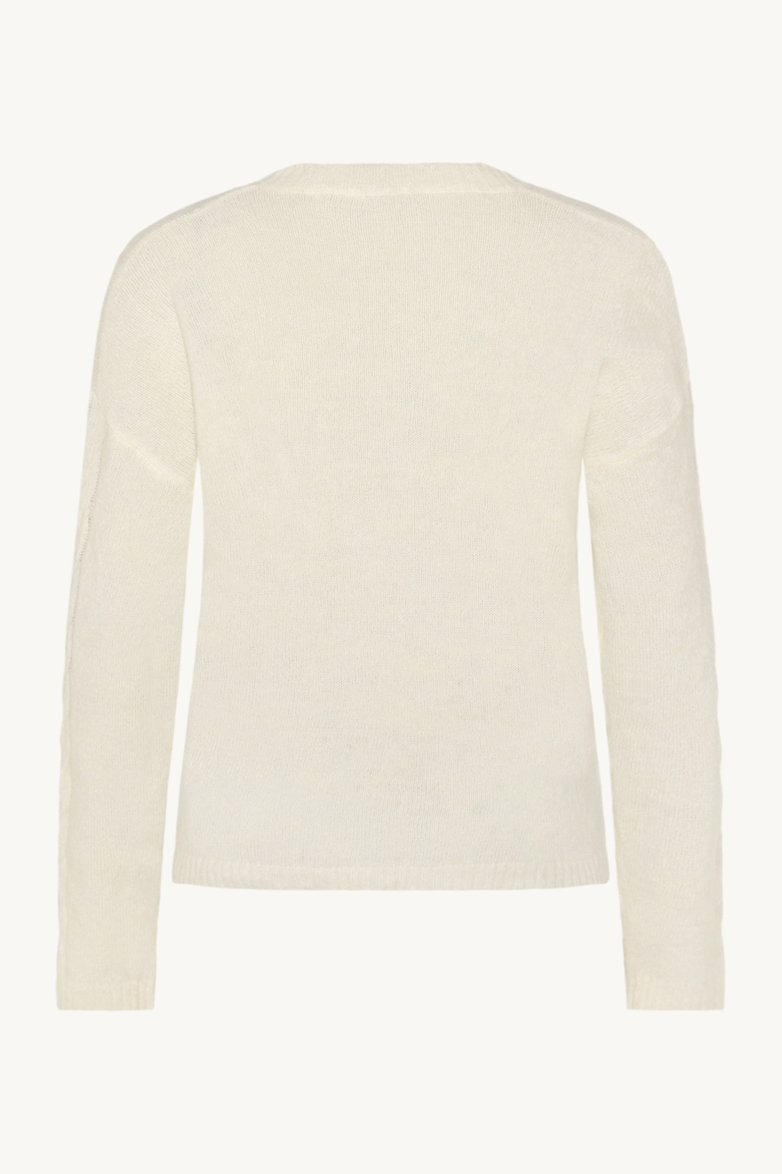 Pullover i mjuk mohairblandning med V-ringning. Modellen har kabelstickning fram och ribbstickad vid halsringning, nertill på ärmarna och nertill. Denna produkt är certifierad SMART MATERIAL CHOICE.