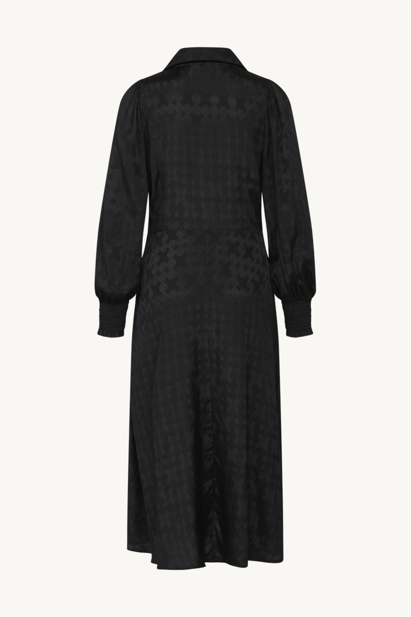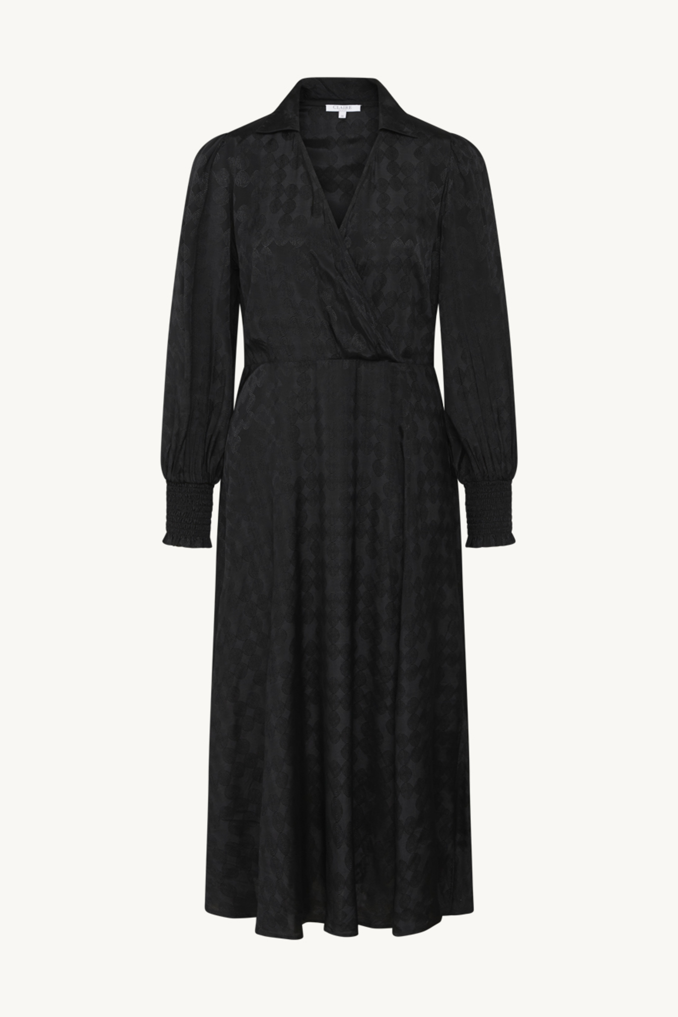 Lyxig svart jaquard-mönstrad klänning från Claire. Liten krage i halsen, omlott i ringningen, markerad midja, smock i ärmslut. Härlig vidd i kjolen med en liten slits fram till vänster som ger en smickrande siluett. Stängs med dolt blixtlås i sidan.