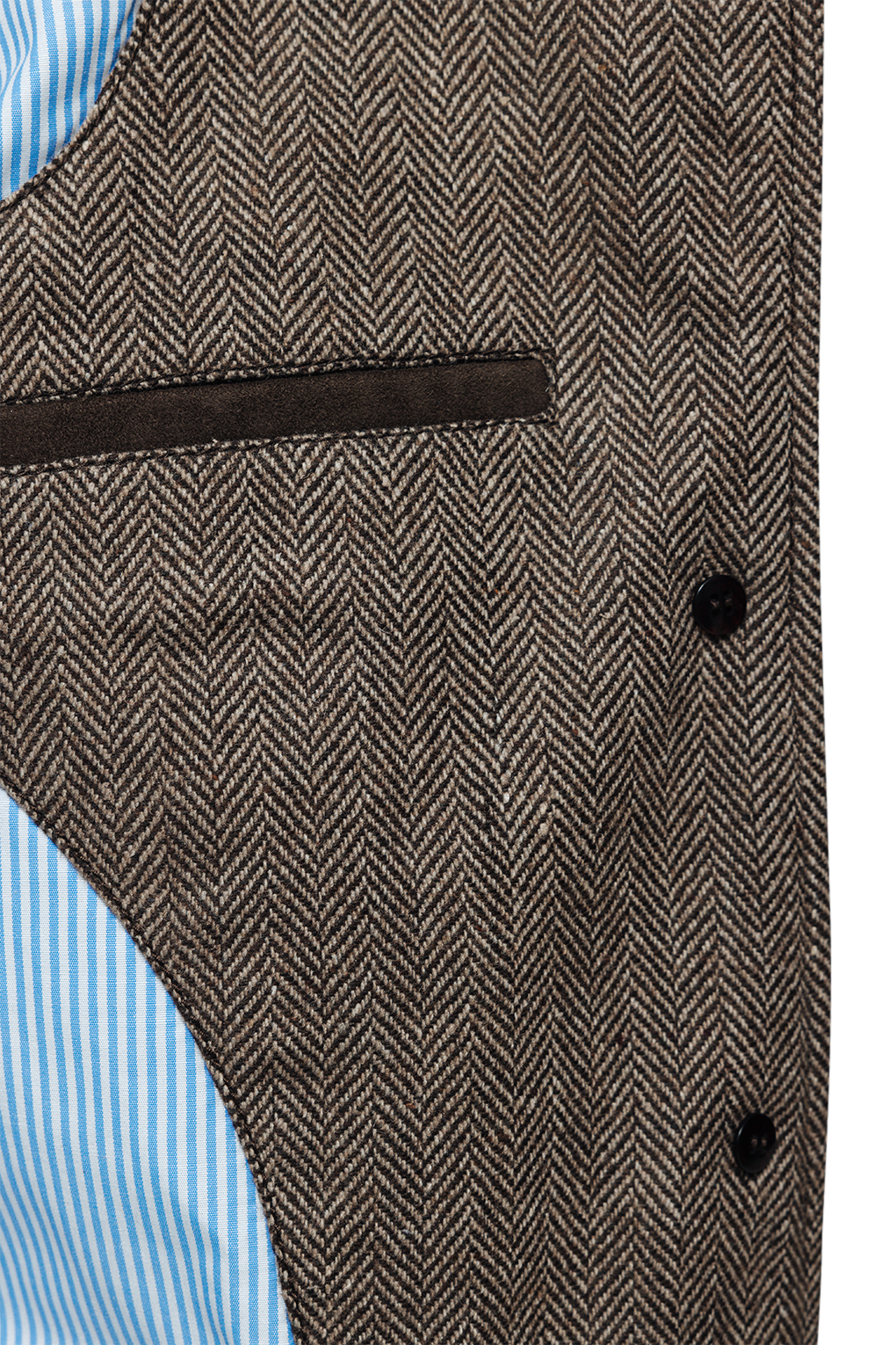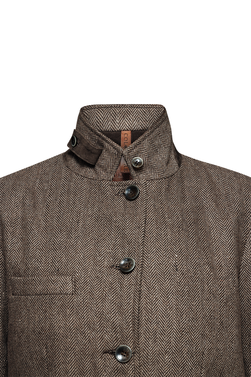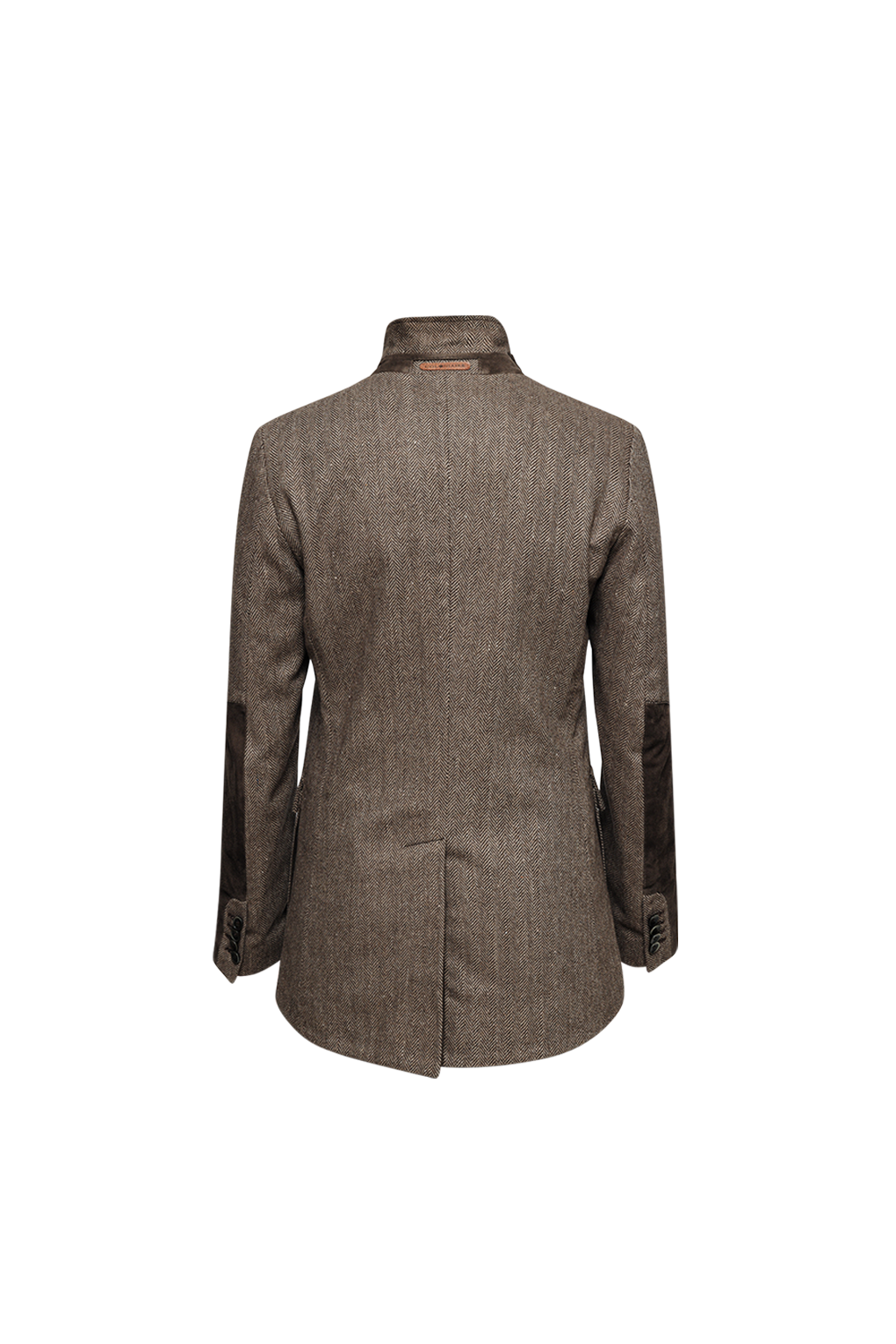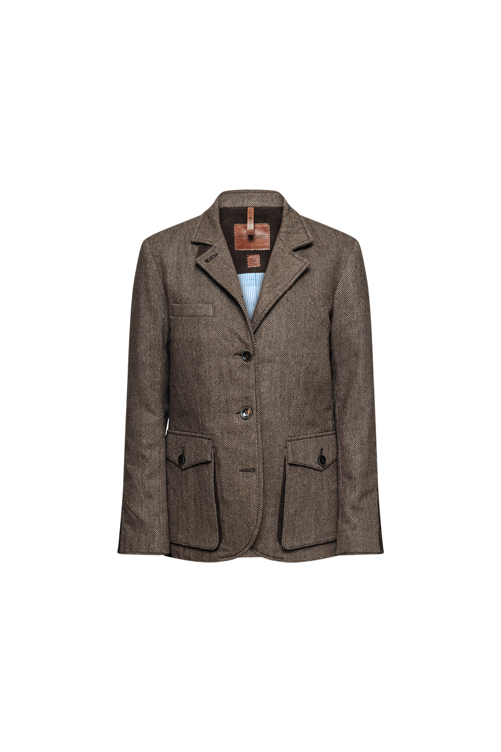 Denna dam kavaj med 5 knappar är tillverkad i ett tweed-fiskbensmönster med detaljer i matchande kaffebrun mocka. Jackan kan bäras på olika sätt. Antingen kan du vika ner slaget för att få det att se mer ut som en traditionell kavaj med 3 knappar, eller så kan du låta slaget stå upprätt och få det att se mer ut som en uniformjacka. Jackan har en bröstficka och två nedre bälgfickor med ficklock och mockadetaljer på sidan. Jackan har unika mockadetaljer på ärmarna. Jackan har en kragrem i mocka och även en del av kragen är tillverkad i mocka. Baktill har jackan sidoslut för bättre rörlighet ute på planen. Jackan är helfodrad med en blå/vit bomullsrand.