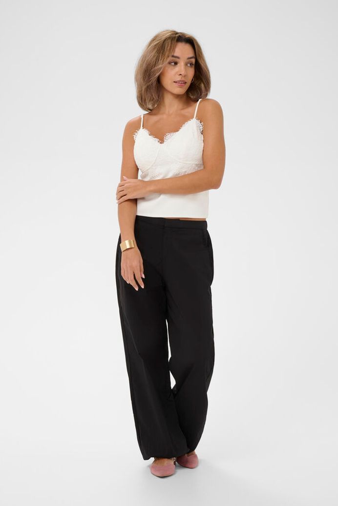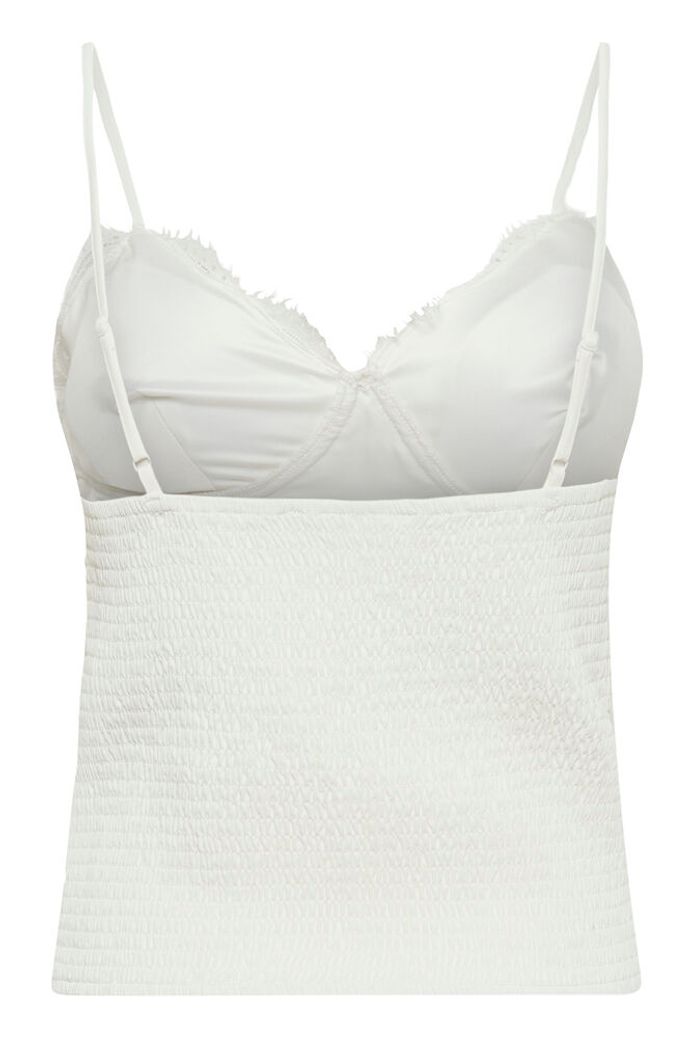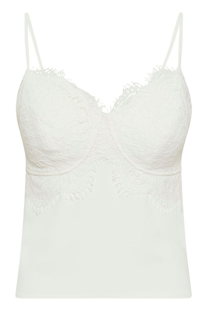 Linne med spetsdetaljer som har figurnära passform och utskuren spets vid bysten. Smala justerbara axelband och rak nederkant. Spetsöverlagret tillför struktur upptill.