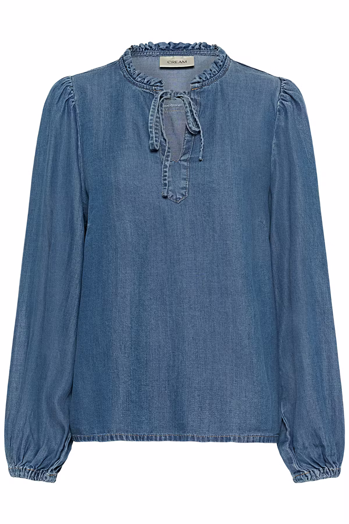 Denimblus med rak silhuett, mjuk finish, rynkad rund ringning med knytband och långa ärmar med resår vid ärmslut.