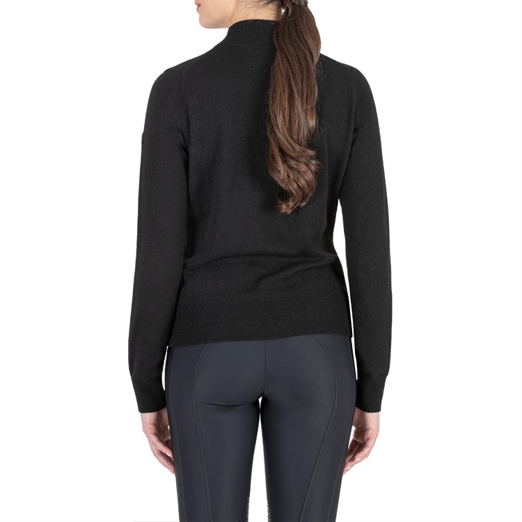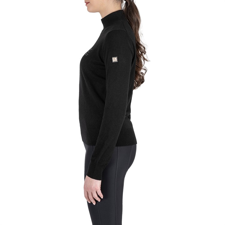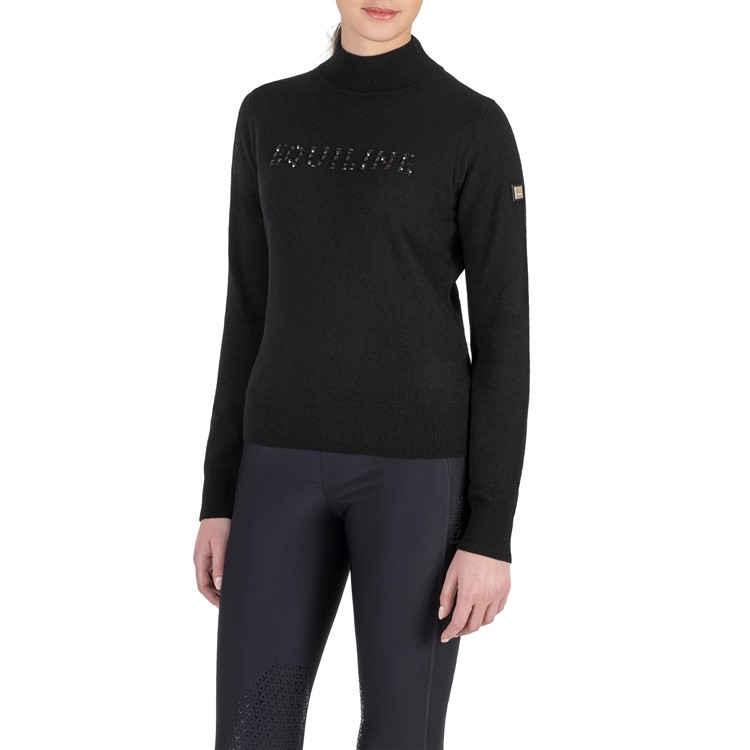 En varm och mjuk tröja i figurnära skärning från Equiline. Bra andasfunktion. Mjuka ribbade muddar i hals, ärmslut och midja. Equilinelogga i svart cabochon.