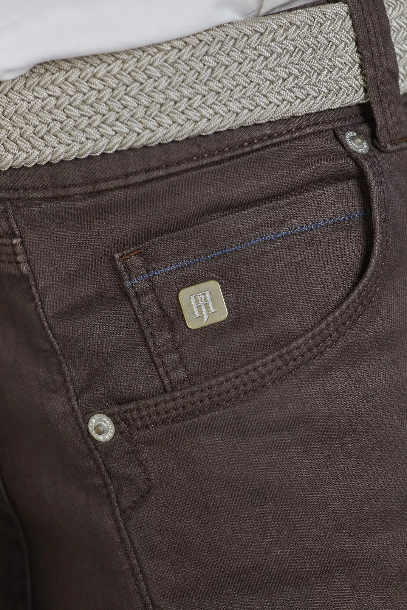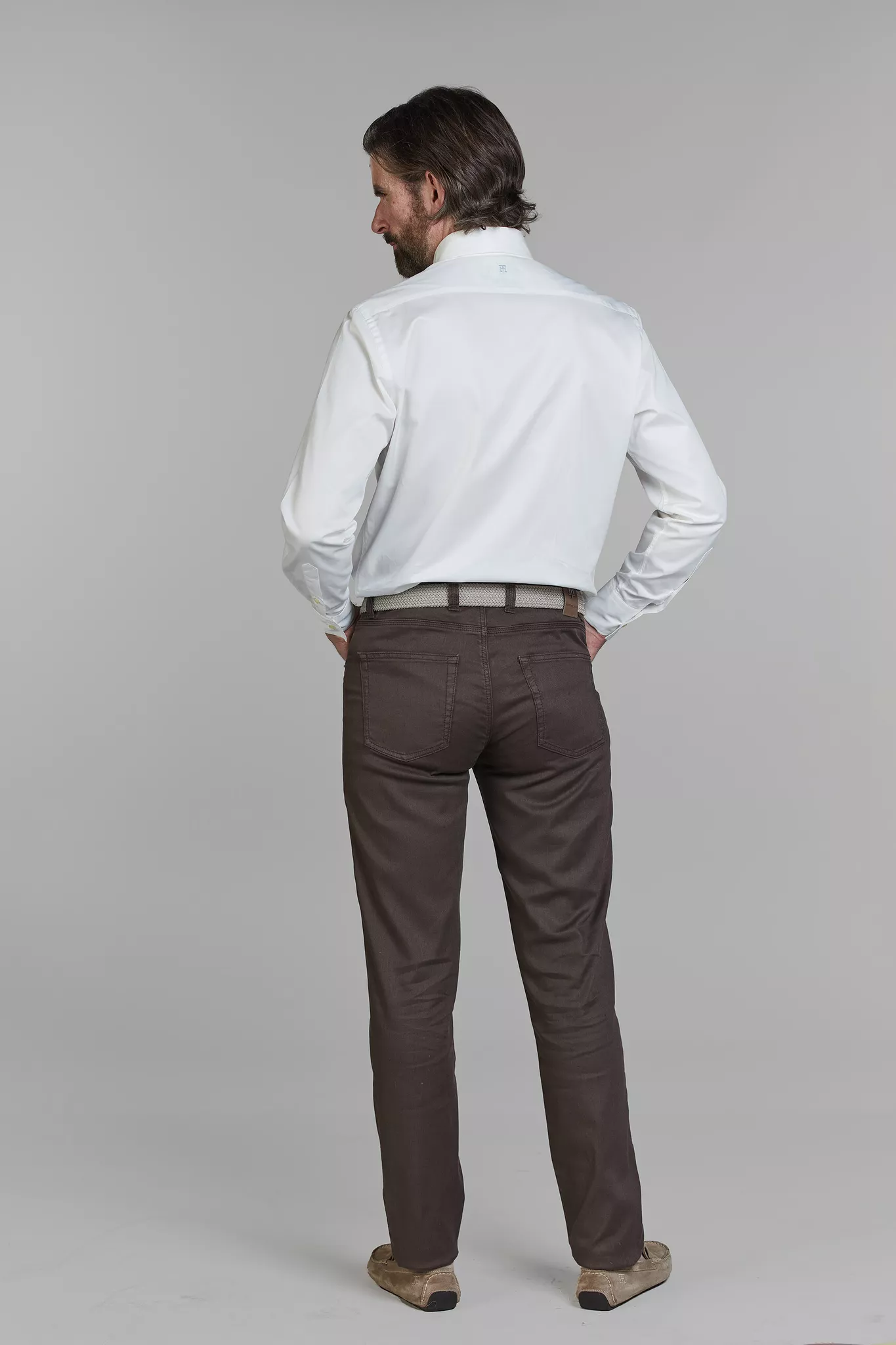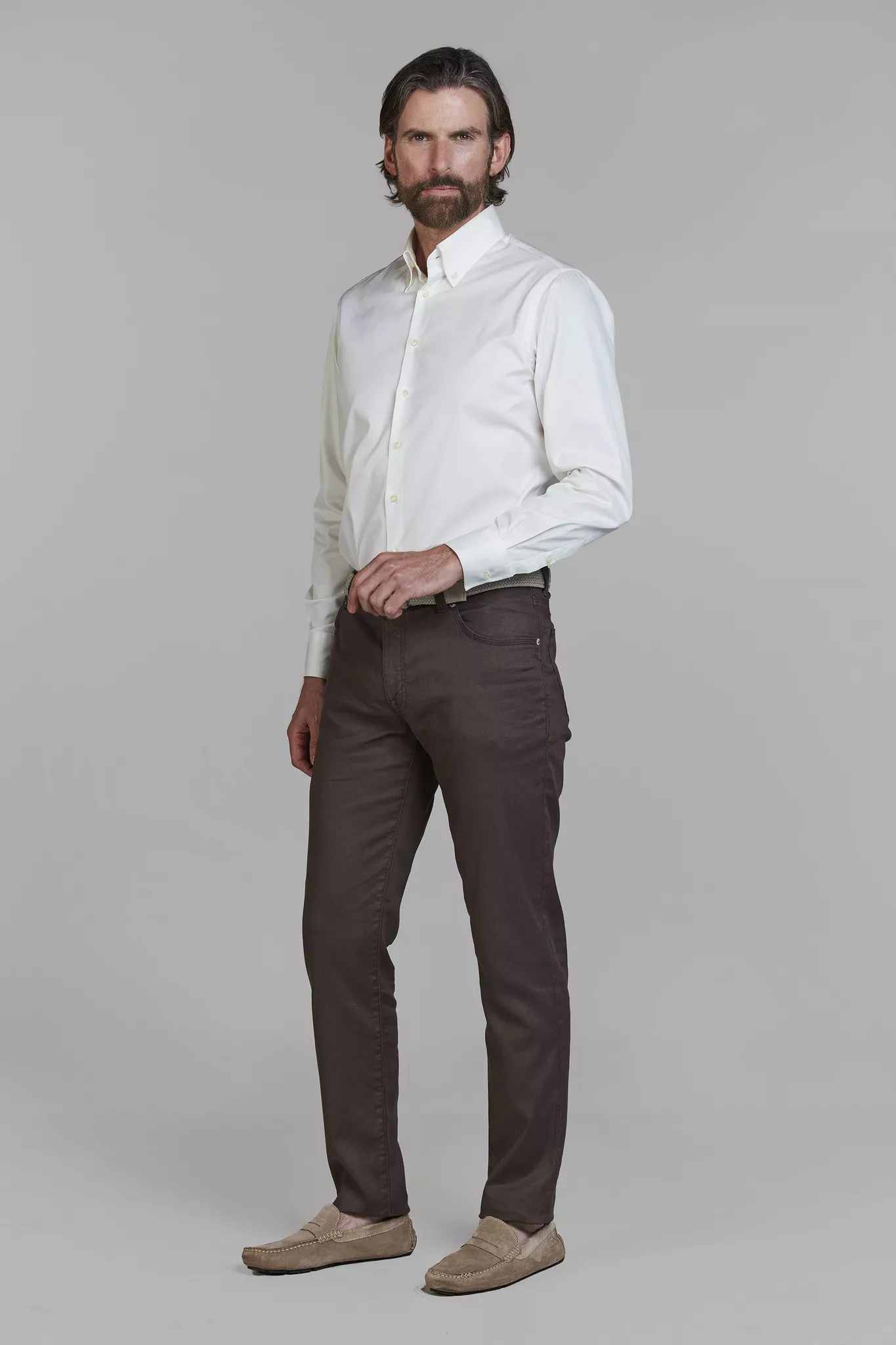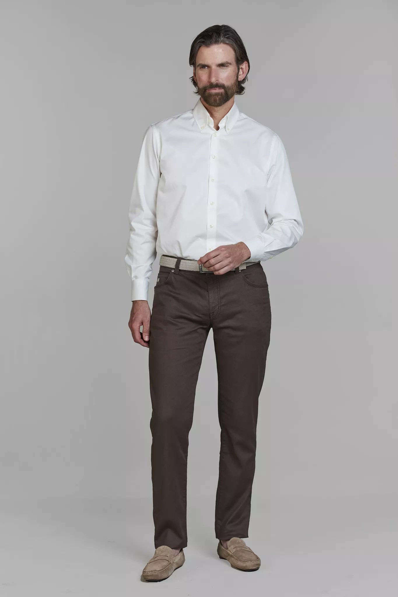 Denna femficksbyxa i bomull och linne kombinerar naturlig lätthet med premiumkvalitet. Självlåsande YKK-dragkedja och stretch för perfekt passform, producerad i fabriker där lyx och hållbarhet går hand i hand.