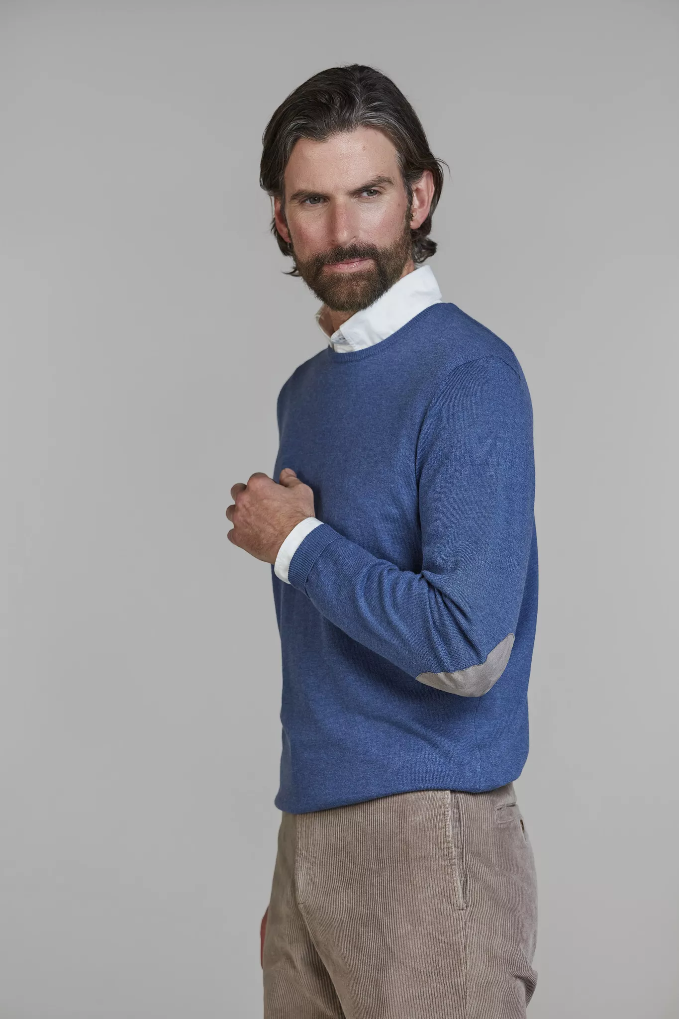 Stickad tröja, Rund hals, Bomull/Kashmir, Ärmpatch, 12gg, Modellen har medium
