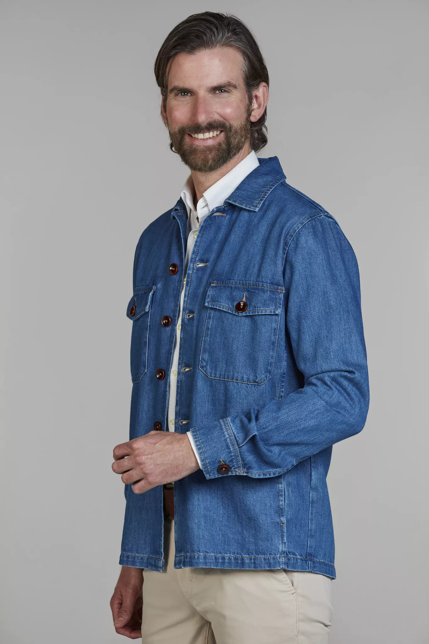 Denim-overshirt med fyra fickor och knappar. Tillverkad av förstklassigt tyg i fabriker som specialiserar sig på premiumplagg för en avslappnad men lyxig look.