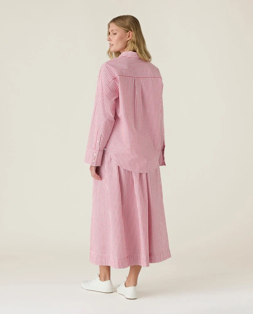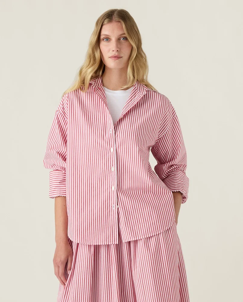 Omfamna enkel stil med vår Casual Organic Cotton Poplin Shirt i ett charmigt randmönster. Tillverkad av premium 100% ekologisk bomull percale poplin med en distinkt seersucker-textur, erbjuder denna skjorta exceptionell andningsförmåga och komfort för vardagsanvändning. Den avslappnade casual fit-passformen har genomtänkt nedhasade axlar och långa ärmar för en laid-back silhuett som rör sig med dig genom dagen.