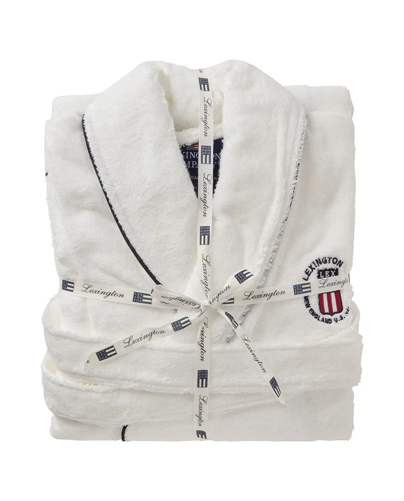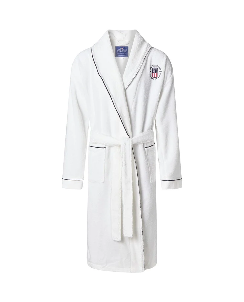 Vår morgonrock i frotté med kontrasterande kantband är den perfekta julklappen som håller dig varm och mysig under julhelgen och framöver. Den är tillverkad av en extra mjuk och tung blandning av bomull och polyester på 340 gram och dess unisexdesign är perfekt för både honom och henne. Lyxiga avslutande detaljer inkluderar mörkblå kanter och klassiskt Lexington-broderi på bröstet. Denna morgonrock är OEKO-TEX®-certifierad för att säkerställa att den är fri från skadliga ämnen som ofta används inom textiltillverkning och levereras insvept i ett exklusivt Lexington-band.