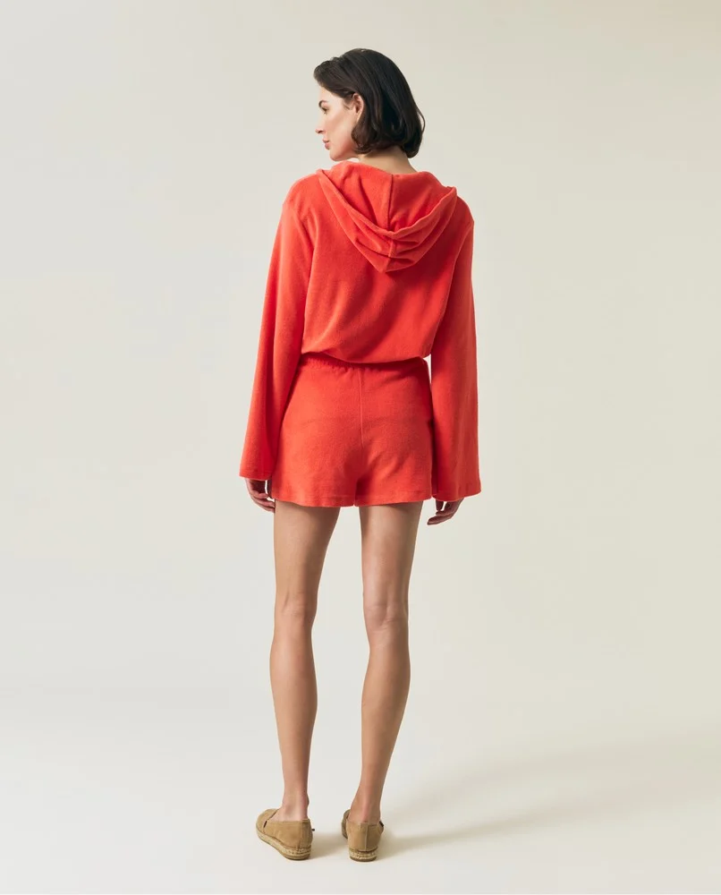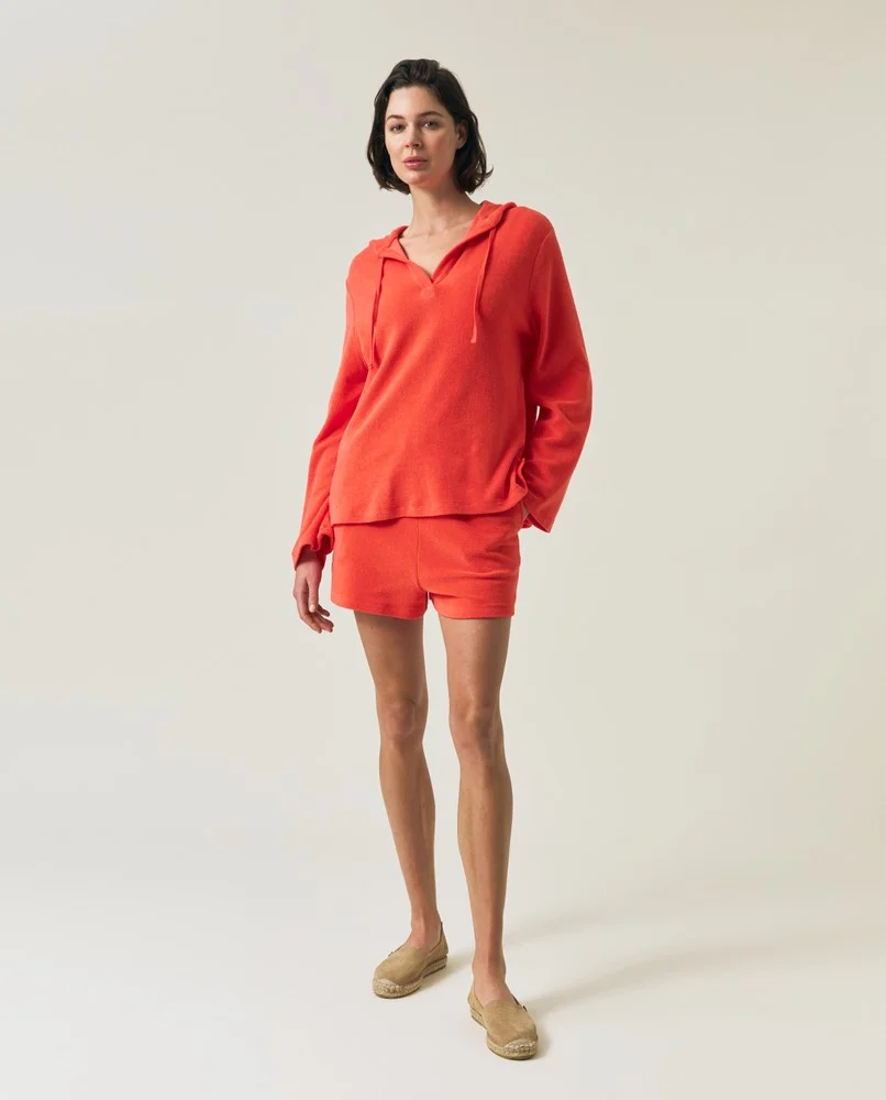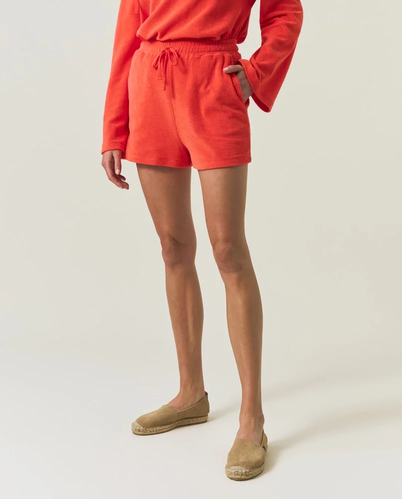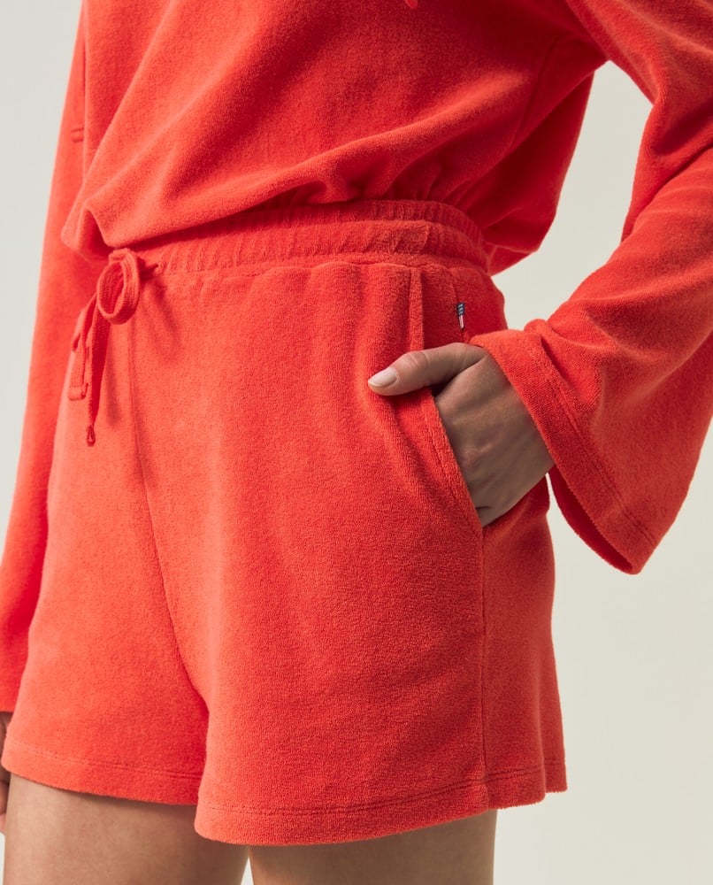 De här shortsen i ekologisk bomullsfrotté i benvitt, rött eller marinblått erbjuder både komfort och stil. De har ett elastiskt midjeband för en säker och justerbar passform och är designade för att enkelt dras på. Sidofickorna tillför praktisk funktion, medan en Lexington-flaggetikett fäst vid midjebandets sidosöm ger en diskret varumärkesdetalj. Shortsen är perfekta för avslappnade utflykter eller avkoppling och kombinerar avslappnad elegans med miljövänliga material, vilket gör dem till ett mångsidigt tillskott i din garderob.
