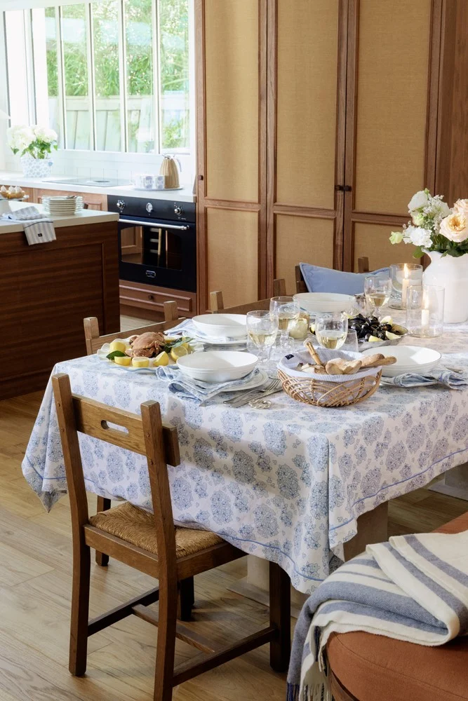 Ge ditt bord ett elegant lyft med denna vackra duk med Lexingtons originalmönster av heltäckande hortensiatryck. De mjuka vårfärgerna skapar en fräsch och inbjudande atmosfär, perfekt för både vardagsmiddagar och speciella tillfällen. Tillverkad i ekologisk bomull och producerad i en certifierad Green Factory Building – ett hållbart val utan att kompromissa med stil eller kvalitet. Den klassiska designen är långvarig och matchar perfekt med den tillhörande servetten i samma mönster. Detaljerad med en vävd Lexington logotyp-etikett i hörnet och Oeko-tex certifierad.