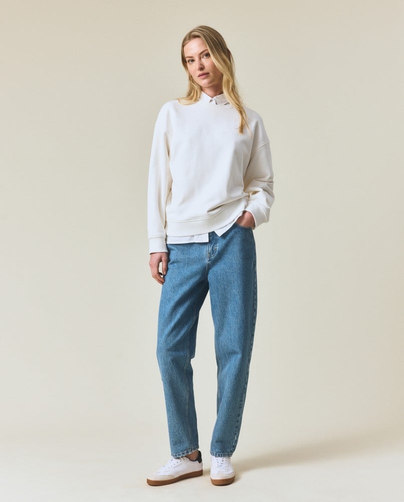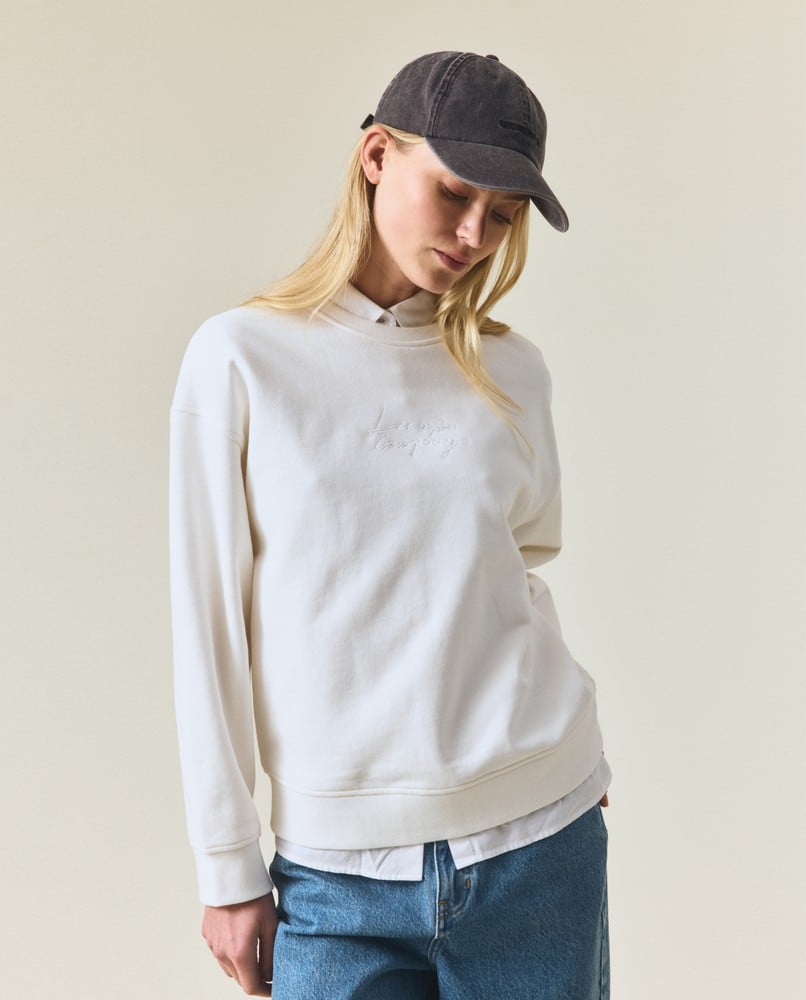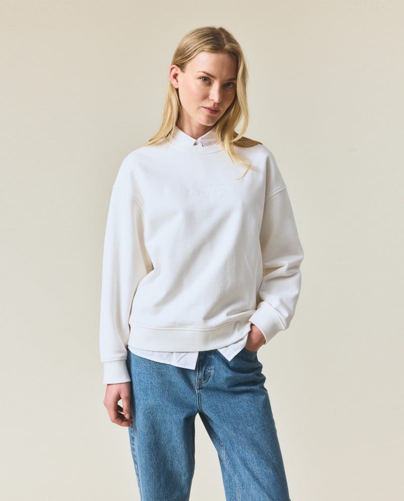 Uppgradera din vardagsgarderob med vår Logo Sweatshirt i mjuk off-white. Tillverkad av förstklassig 100% french terry-bomull för exceptionell komfort, denna oversized sweatshirt har subtil tonfärgad logobrodyr på bröstet för en elegant touch. Den rundade halsringningen och de långa ärmarna med 1×1 ribbning vid ärmslut och nederkant ger ett klassiskt utseende med en modern passform. Perfekt för lager-på-lager-styling under kallare säsonger eller som ett enskilt plagg för avslappnade tillfällen.