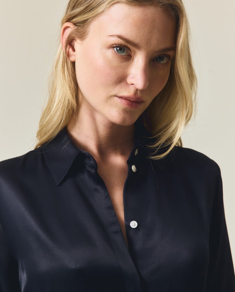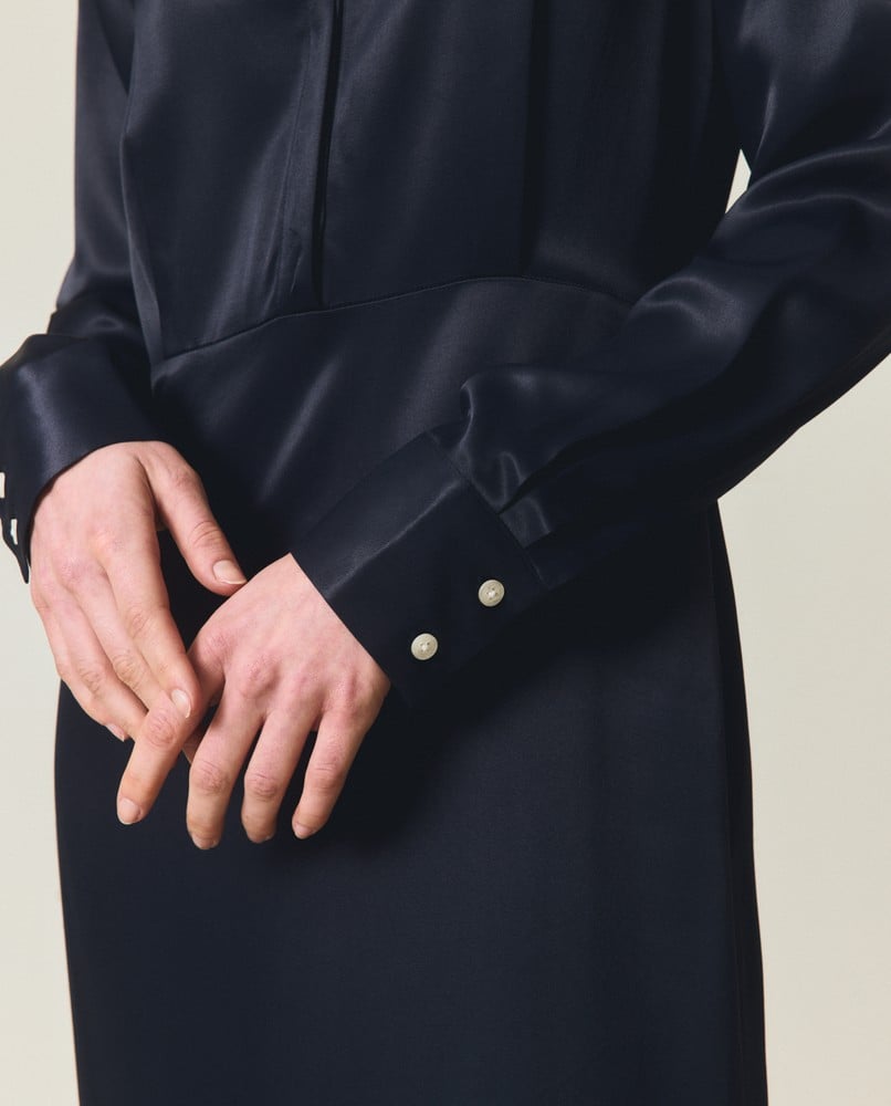 Förhöj din garderob med vår Maxi Satin Shirt Dress, ett tidlöst plagg som enkelt fungerar från dag till kväll. Tillverkad av en lyxig blandning av viskos och rayon med glänsande satinyta, faller denna hellånga klänning vackert samtidigt som den behåller sin klassiska skjortklänningssiluett. Den dolda knappslån skapar en slät front, medan genomtänkta veck och insnitt förhöjer den feminina formen. Vi har lagt till förfinade detaljer som eleganta ärmmanschetter med knäppning och en praktisk sidodragkedja för smidig användning. I en mångsidig mörkblå marin nyans kombineras detta plagg perfekt med både casual ballerinaskor för dagtid eller utmärkande smycken och klackar för mer formella tillfällen.