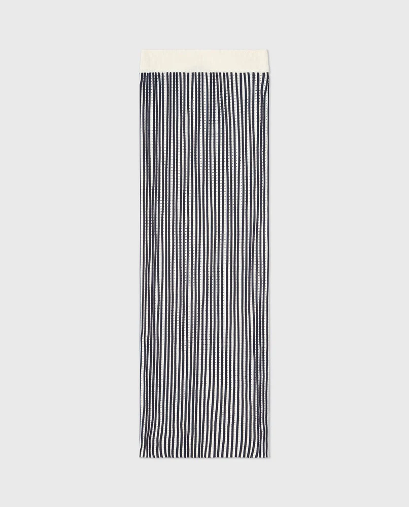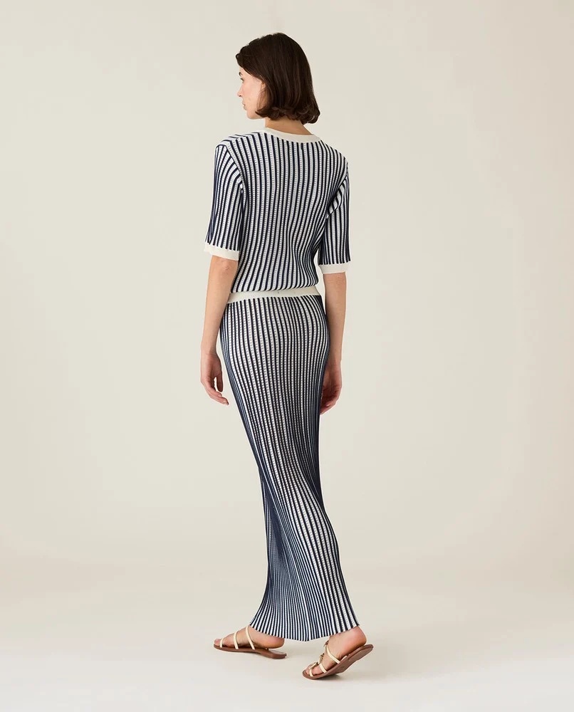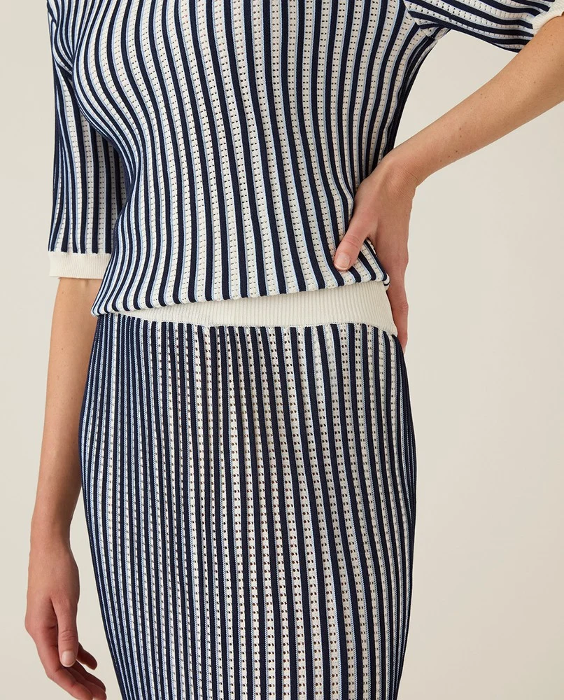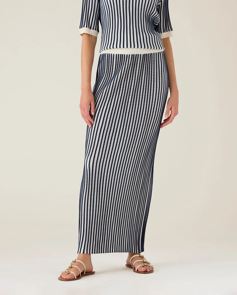 Lyft din garderob med vår Multi Striped Knitted Skirt, en sofistikerad plagg som perfekt balanserar komfort och stil. Tillverkad av en lyxig blandning av viskos och polyamid, denna kjol har en intrikat 3D jacquardstickning med iögonfallande genombruten detaljer och skarpa kontrastränder i mörkblått och vitt.