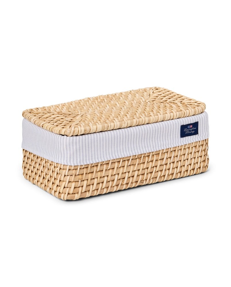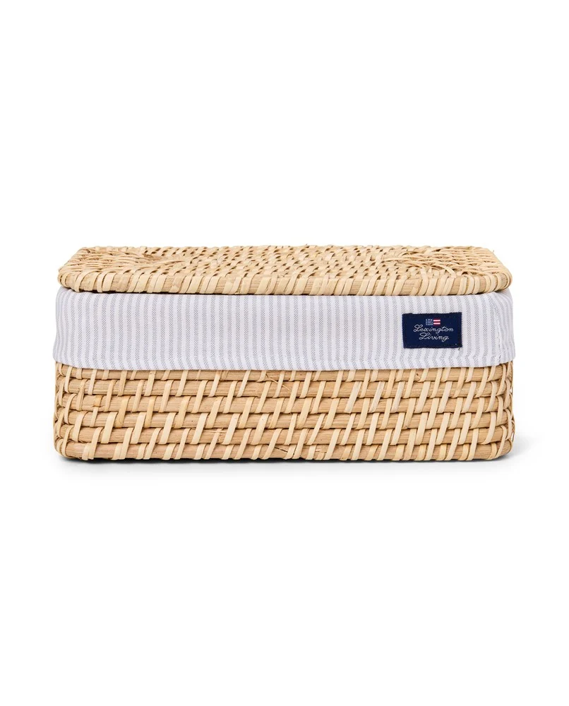 Upptäck vår handgjorda rottingkorg med lock, tillverkad av högkvalitativ rotting för hållbarhet och elegans. Denna mångsidiga korg har ett foder tillverkat av Lexingtons traditionella pinpoint oxford-tyg, som visar upp en elegant beige och vitrandig design. Fodret är lätt att ta bort för bekväm tvätt, och korgen mäter 28 x 21 x 12 cm, vilket gör den perfekt för förvaring eller organisation. Lexington Living-etiketten lägger till en touch av sofistikering, vilket gör den till ett vackert komplement till alla heminredningar.