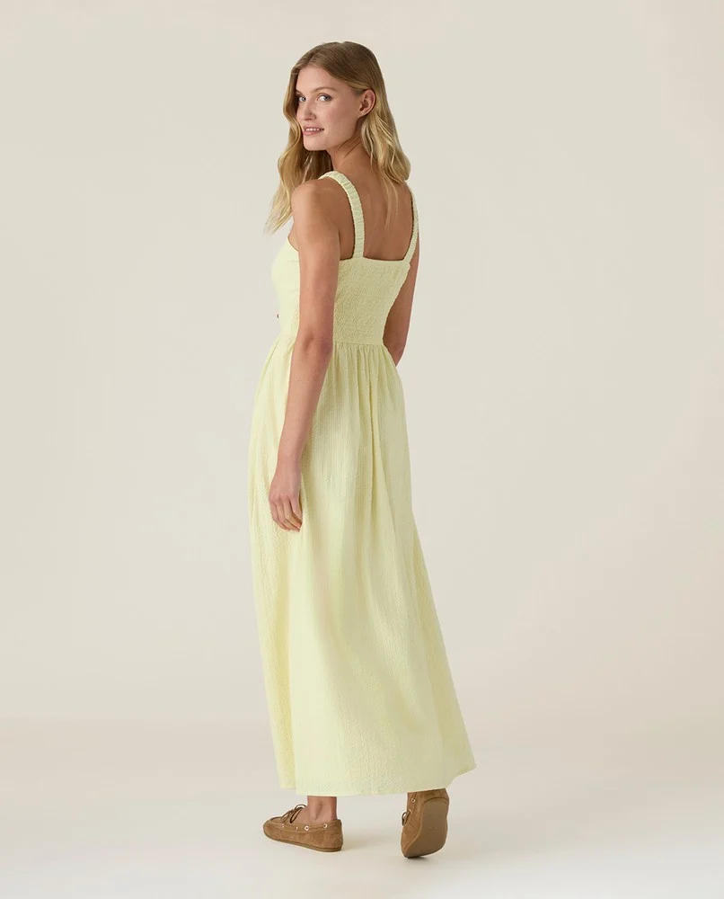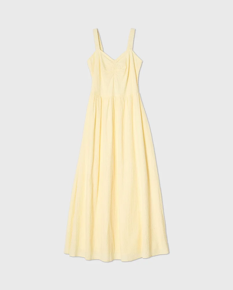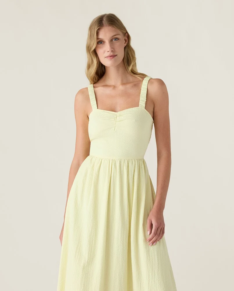 Omfamna en enkel sommarstil med vår Seersucker Summer Dress i livfull gul färg eller vit. Denna charmiga fit and flare-klänning har rynkade axelband och detaljer vid bysten som skapar en smickrande feminin silhuett, medan den smockade baksidan säkerställer en bekväm och justerbar passform. Kjolen i full längd flyter vackert och gör den perfekt för allt från avslappnade helgutflykter till sommarträdgårdsfester.