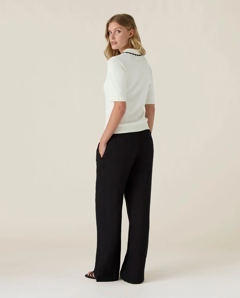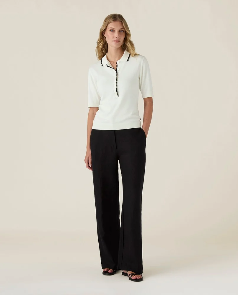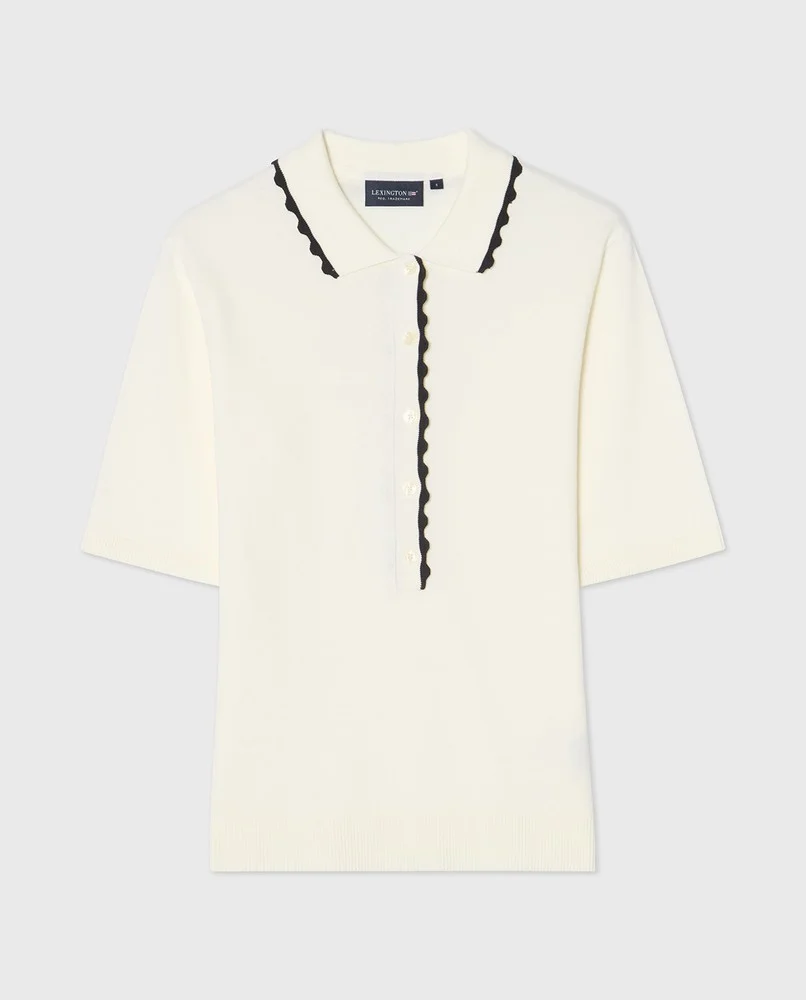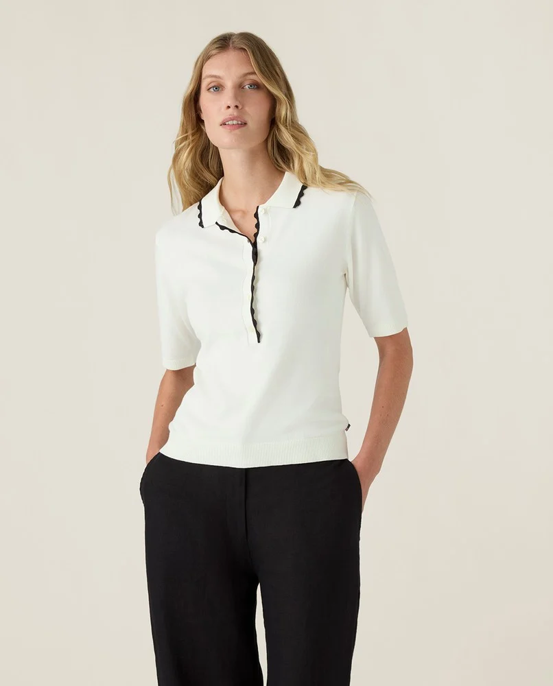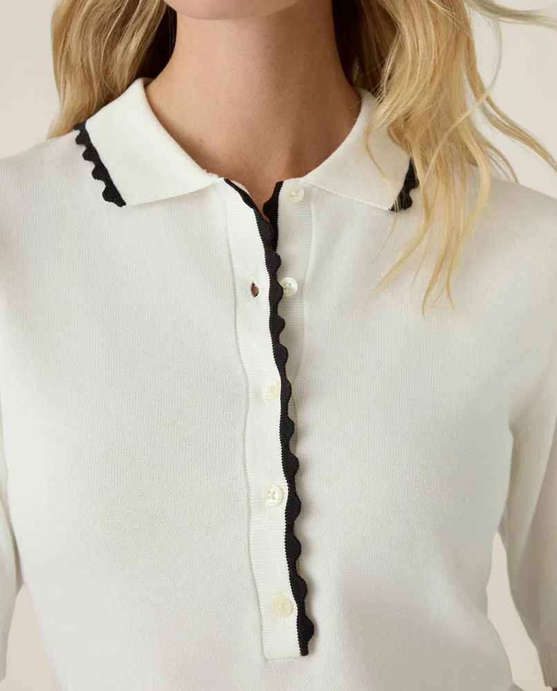 Upphöj din garderob med vår sofistikerade polo-tröja i ljusblå eller vitt, expertmässigt tillverkad i slätstickad konstruktion för tidlös elegans. Detta raffinerade plagg har en klassisk krage med knappstängning och helnålsplacket, förhöjt av elegant vågig kantdetalj runt kragen och placketöppningen för en distinkt finish.