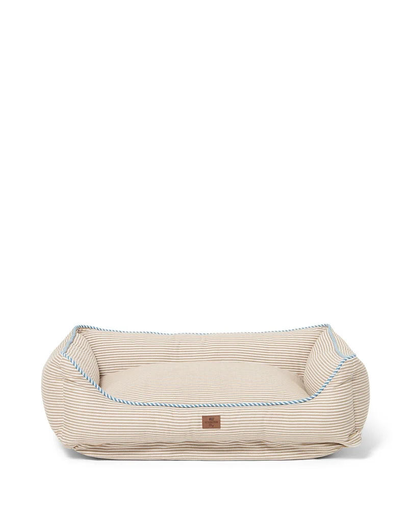 Denna randiga hundbädd i ekologisk bomull erbjuder den perfekta kombinationen av komfort och hållbarhet för ditt älskade husdjur. Med klassiska beige och vita ränder samt blå och vita randiga paspoal, kombinerar bädden Lexingtons signaturstiln med praktisk funktionalitet. De upphöjda mjuka sidorna ger en mysig viloplats där din hund kan bädda ner sig, medan den avtagbara inre kudden säkerställer enkel rengöring. Tillverkad av miljövänliga material och producerad i en certifierad Green Factory Building med Oeko-tex-certifiering, är denna genomtänkta produkt från Lexington Dog Collection lika snäll mot planeten som den är bekväm för din fyrbenta vän.