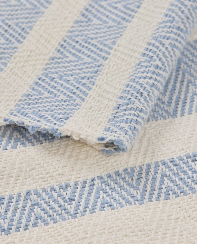 Förhöj ditt bord med denna tidlösa randiga fiskbenslöpare, tillverkad av 100 % ekologisk bomull i mjukt himmelsblått och vitt. Den klassiska designen, tillsammans med en avslappnad men elegant känsla, gör den perfekt för alla tillfällen. Färdig med vikta kanter och en logotypetikett i återvunnen polyester erbjuder den både stil och hållbarhet. Oeko-Tex certifierad och producerad i en grön fabrik, denna löpare är byggd för att hålla. Finns i 50×150 cm och 50×250 cm. Tillverkad i Indien.