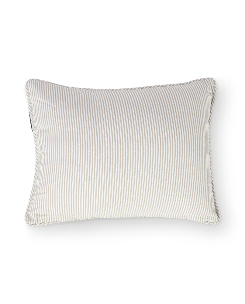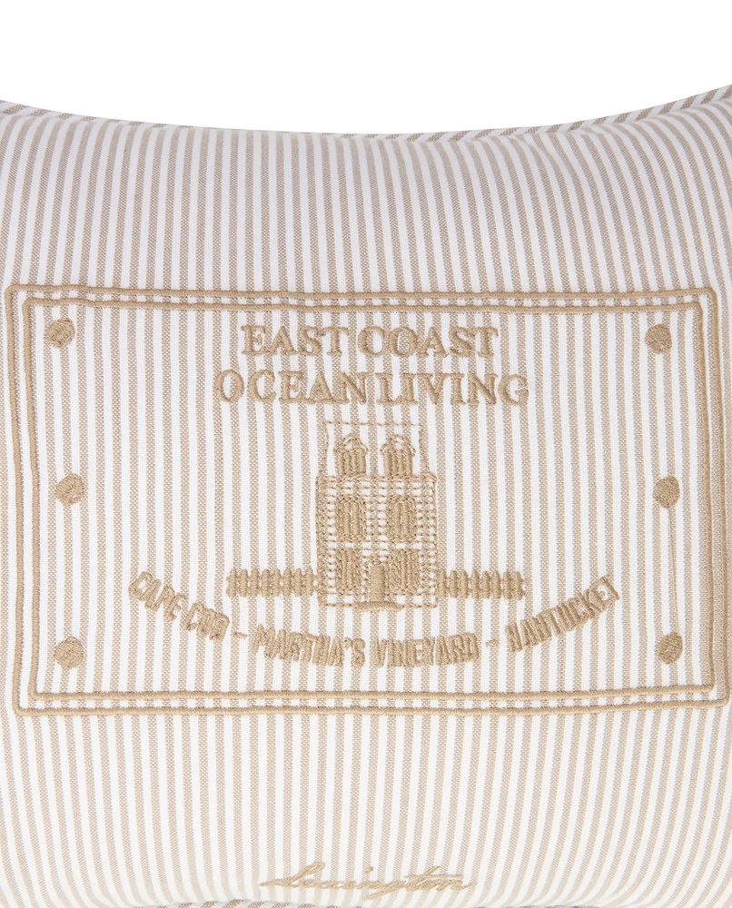 Den klassiska randiga kudden i beige och vitt från Lexington tillför tidlös elegans till ditt hem med sin mjuka ekologiska bomull i oxfordväv och originella garnfärgade randdesign. Den broderade logotypen på framsidan och fina paspoalen i samma tyg tillför raffinerade detaljer, medan den dolda färgmatchade dragkedjan säkerställer ett sömlöst utseende. Tillverkad i en certifierad Green Factory Building och Oeko-tex-certifierad, återspeglar denna kudde vårt engagemang för hållbarhet och kvalitet.